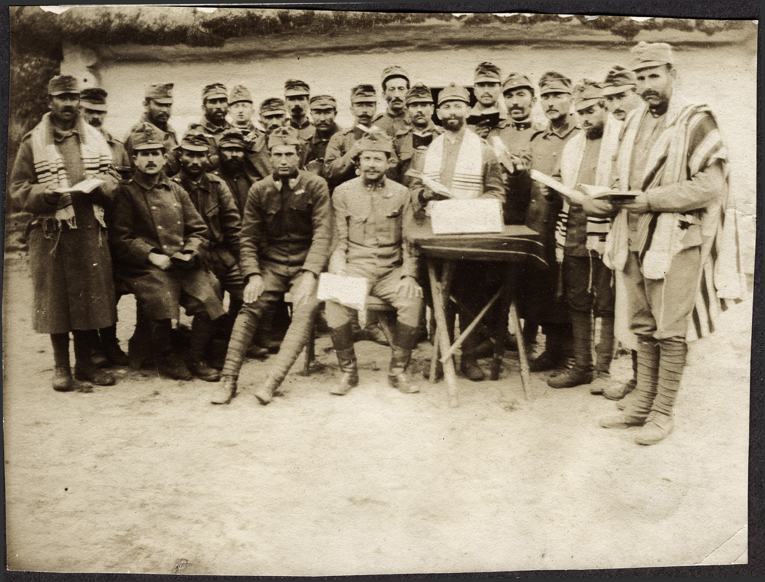 Nazwa: żołnierze Żydzi, modlitwa, data: 1914-1918, miejsce: , typ obiektu: , wymiary11 x 8, opis: Grupa 23 żołnierzy armii austro-węgierkiej podczas modlitwy.