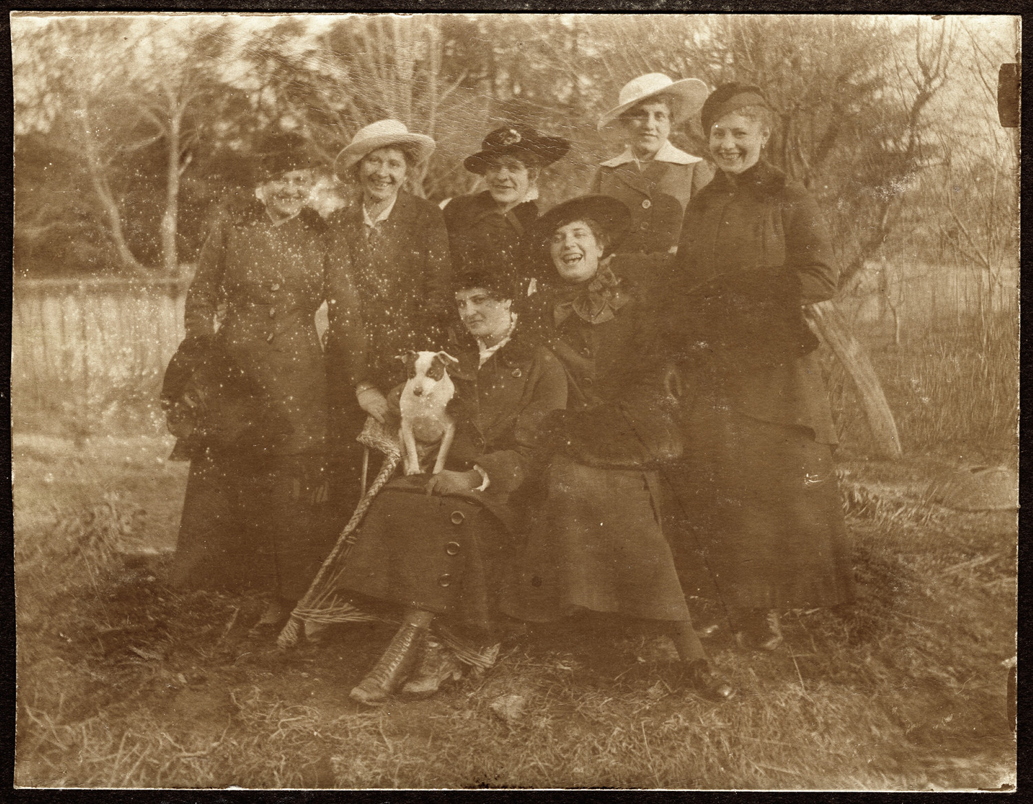 Nazwa: kobiety z psem, data: 1914 - 1918, miejsce: , typ obiektu: , wymiary11,2 x 8,7, opis: Upozowana grupa siedmiu kobiet