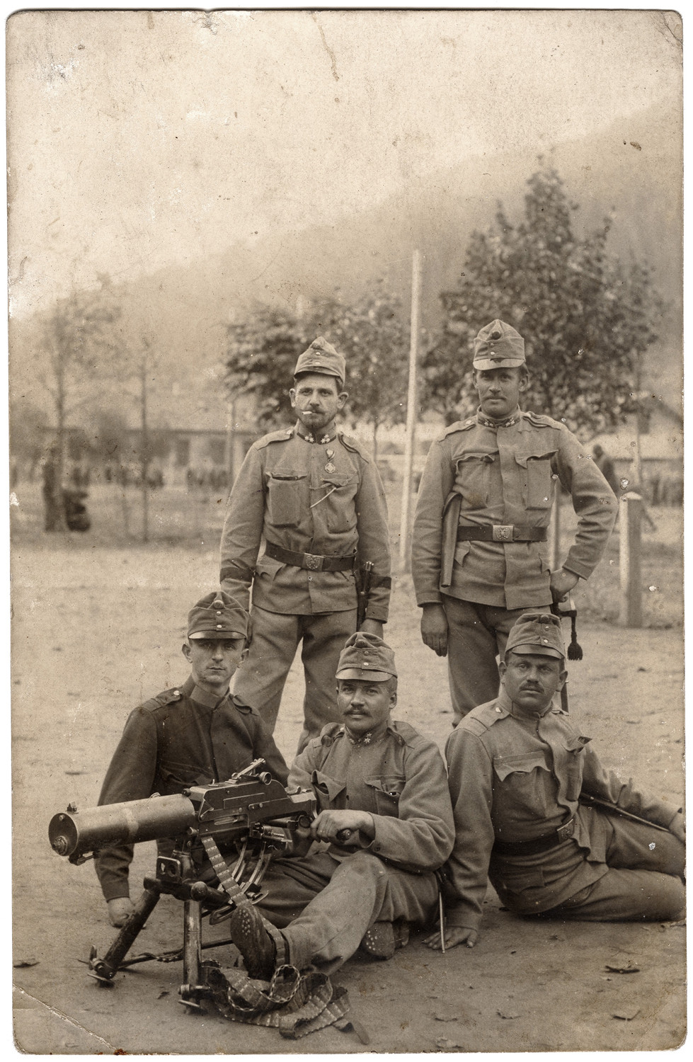 Nazwa: 5. wojskowych w mundurach armii austro-węgierskiej, portret zbiorowy w plenerze, z karabinem maszynowym, fot. z albumu zw. temat. z frontem ros. w cz.I wojny świat., data: 1915-1917, miejsce: , typ obiektu: , wymiary9,0 x 13,9, opis: żołnierze 5 osób w mł. wieku, mund. polowe piechoty austo-węg., 2. stoi, 3. siedzi na I pl., jeden z nich pozuje z karabinem maszynowym zwr. w l., ujęcie całych postaci, tło: krajobraz z budynkiem i drzewami, grupki ludzi; fot. w pionie.