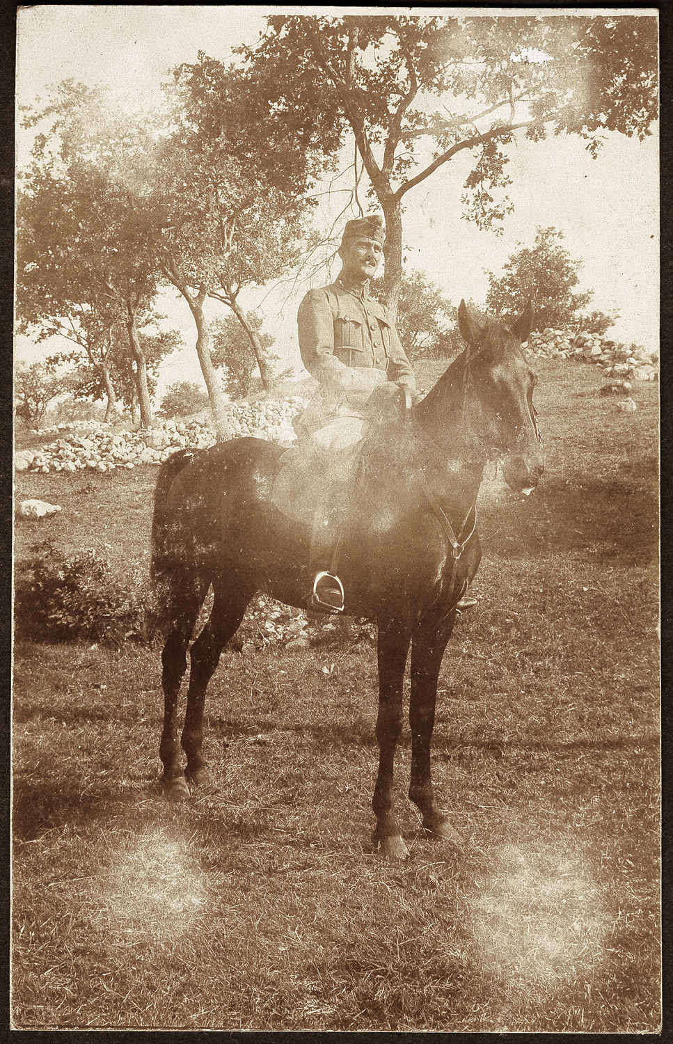 Nazwa: wojskowy w mundurze polowym armii austro-węgierskiej, portret w plenerze, na koniu; fot. z albumu zw. temat. z frontem ros. w cz.I wojny świat., data: 1915-1917, miejsce: , typ obiektu: , wymiary8,9 x 14,0, opis: żołnierz w mł. wieku, na koniu; mundur, ujęcie całej postaci, z dołu, na tle drzew, fot. w pionie.