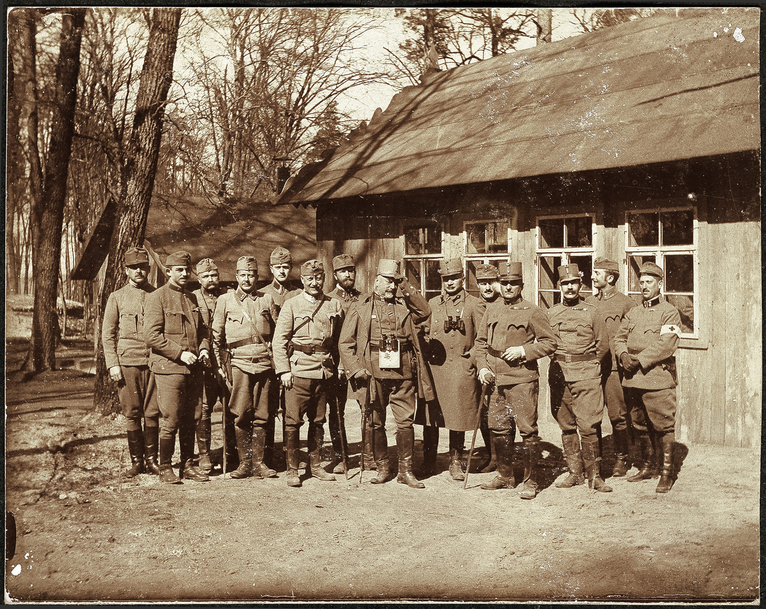 wojskowi w mundurach armii austro-węgierskiej, 14. osób w szeregu; portret zbiorowy w plenerze, przed barakiem; fot. z albumu zw. temat. z frontem ros. w cz.I wojny świat.