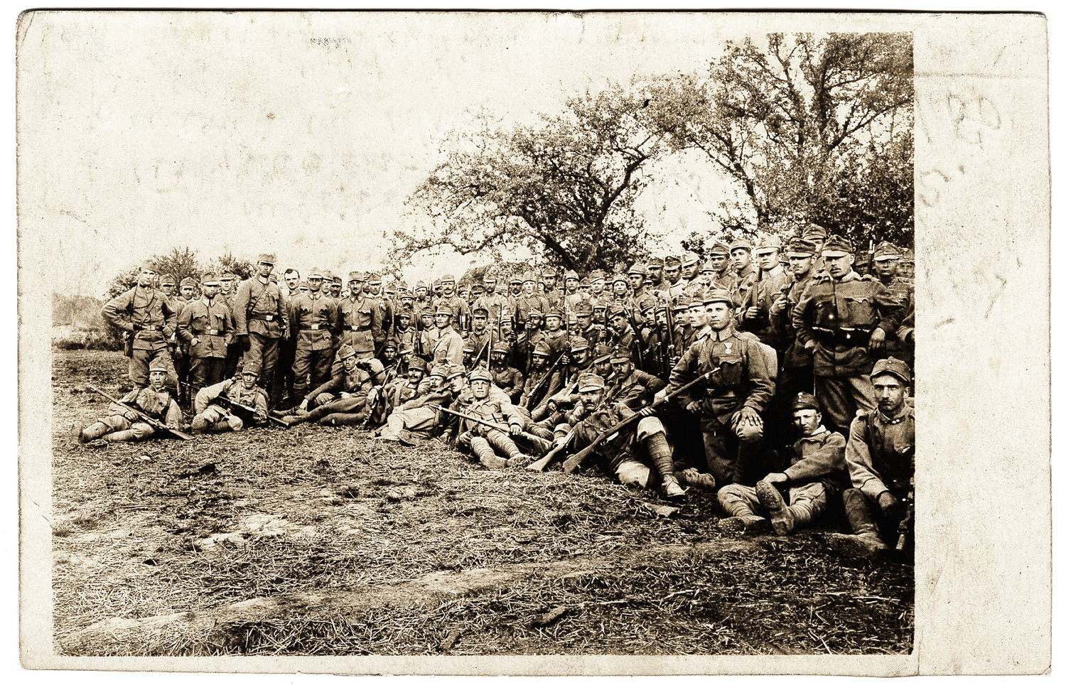wojskowi w mundurach armii austro-węg. oddział piechoty, portret zbiorowy w plenerze, fot. z albumu zw. temat. z frontem ros. w cz.I wojny świat.