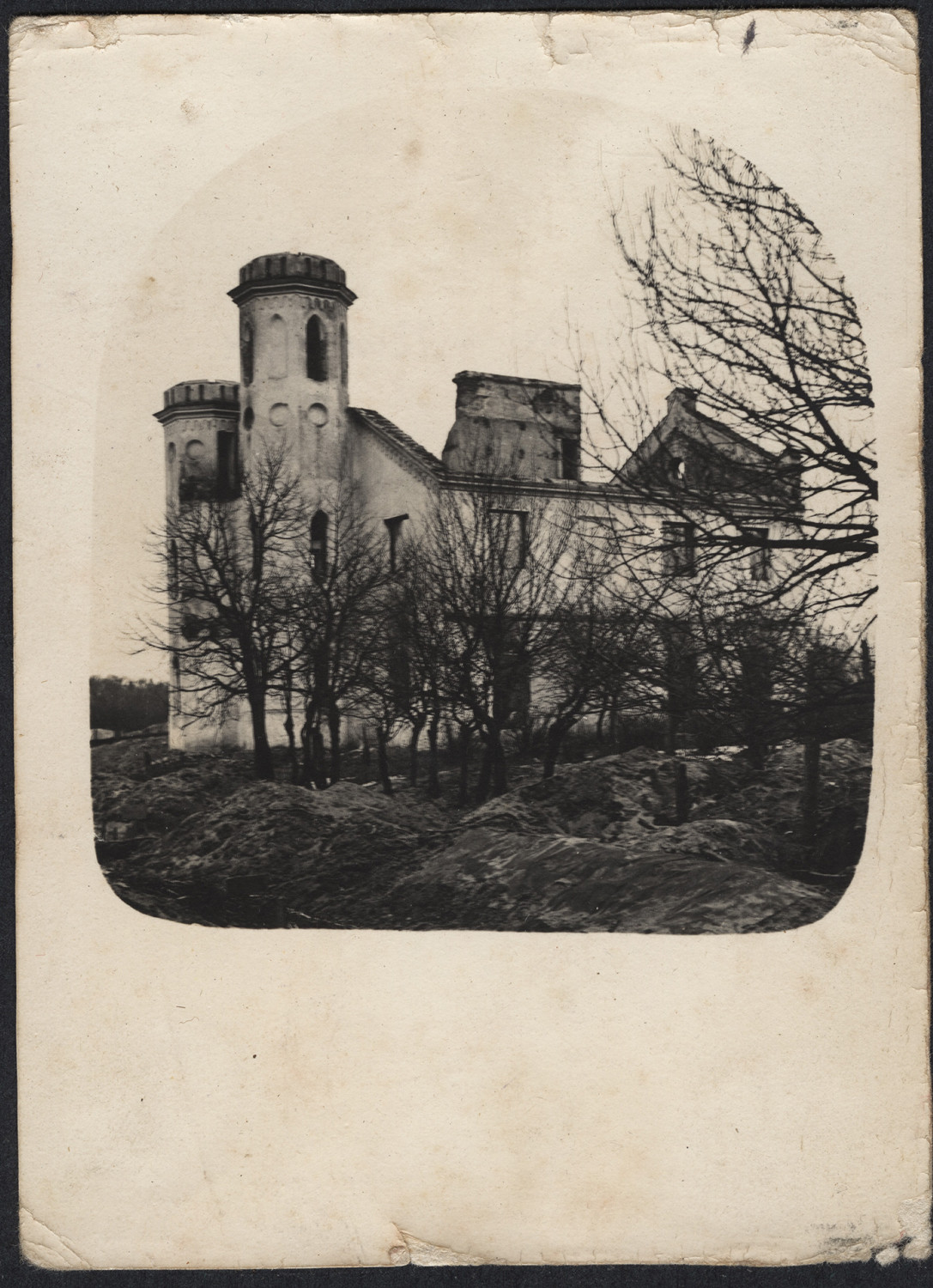 ruiny budynku z 2. wieżami, w masce czworob. z zaokrągl. narożami, fot. z albumu zw. temat. z frontem ros. w cz.I wojny świat.