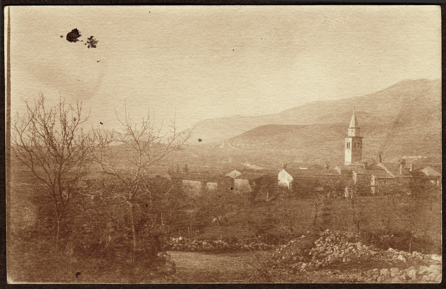 Nazwa: Alpy, panorama miasteczka, data: 1914-1918, miejsce: , typ obiektu: , wymiary8,9 x 13,6, opis: miasteczko z wieżą kościoła, w tle góry, na pierwszym planie niewysokie bezlistne drzewa