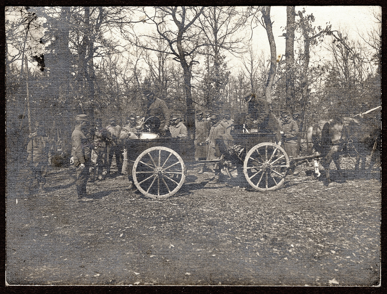 Nazwa: kuchnia polowa, wydawanie posiłku, w lesie, wojskowi w mundurach armii austro-węgierskiej, portr.zbiorowy w plenerze, fot. z albumu zw. temat. z frontem ros. w cz.I wojny świat., data: 1915 - 1916, miejsce: , typ obiektu: , wymiary8,0 x 10,7, opis: żołnierze w mł. wieku ustawieni przy kuchni polowej, mundury, tło: las; fot. w poziomie.