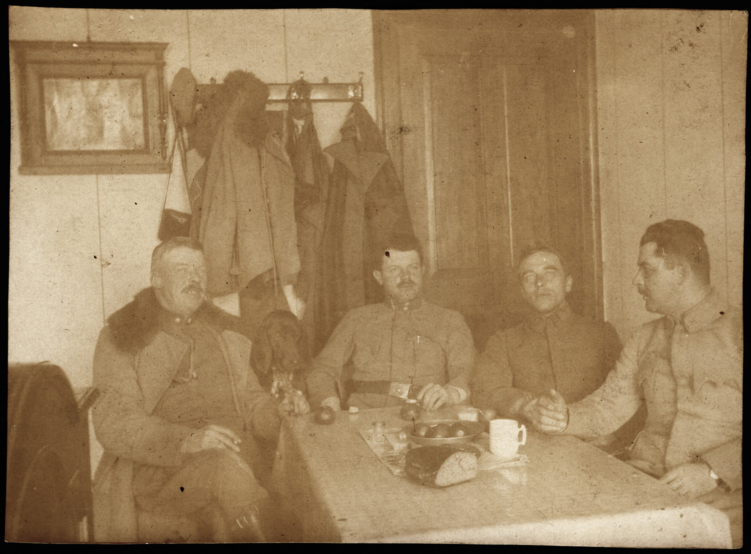 Nazwa: mężczyźni w mundurach armii austro-węgierskiej, data: 1914-1918, miejsce: , typ obiektu: , wymiary8,2 x 11,4, opis: grupa czterech mężczyzn siedzących przy stole