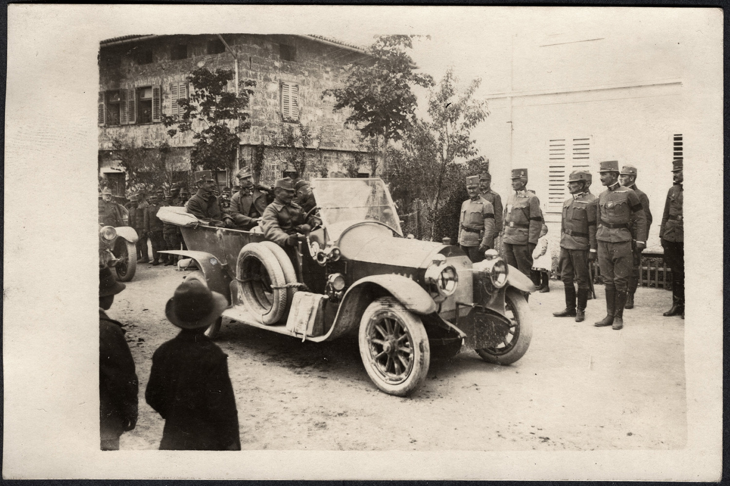 Nazwa: Cesarz Karol I, wizytacja oddziału, data: 1917, miejsce: , typ obiektu: , wymiary8,7 x 11,3, opis: W samochodzie na tylnim siedzeniu widoczny Cesarz Austro-Węgier Karol I, ubrany w mundur polowy