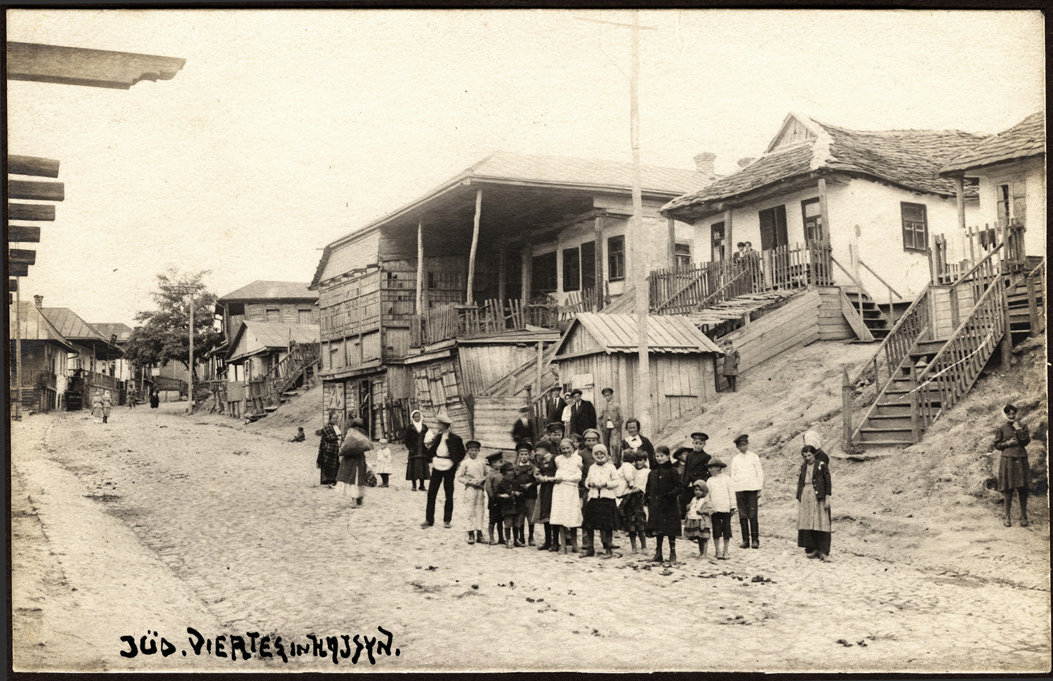 Nazwa: Hajsyn, żydowska dzielnica, data: 1914-1918, miejsce: , typ obiektu: , wymiary13,9 x 8,7, opis: grupa Żydów przed zabudową miasteczka, u dołu adnotacja odręczna w języku niemieckim