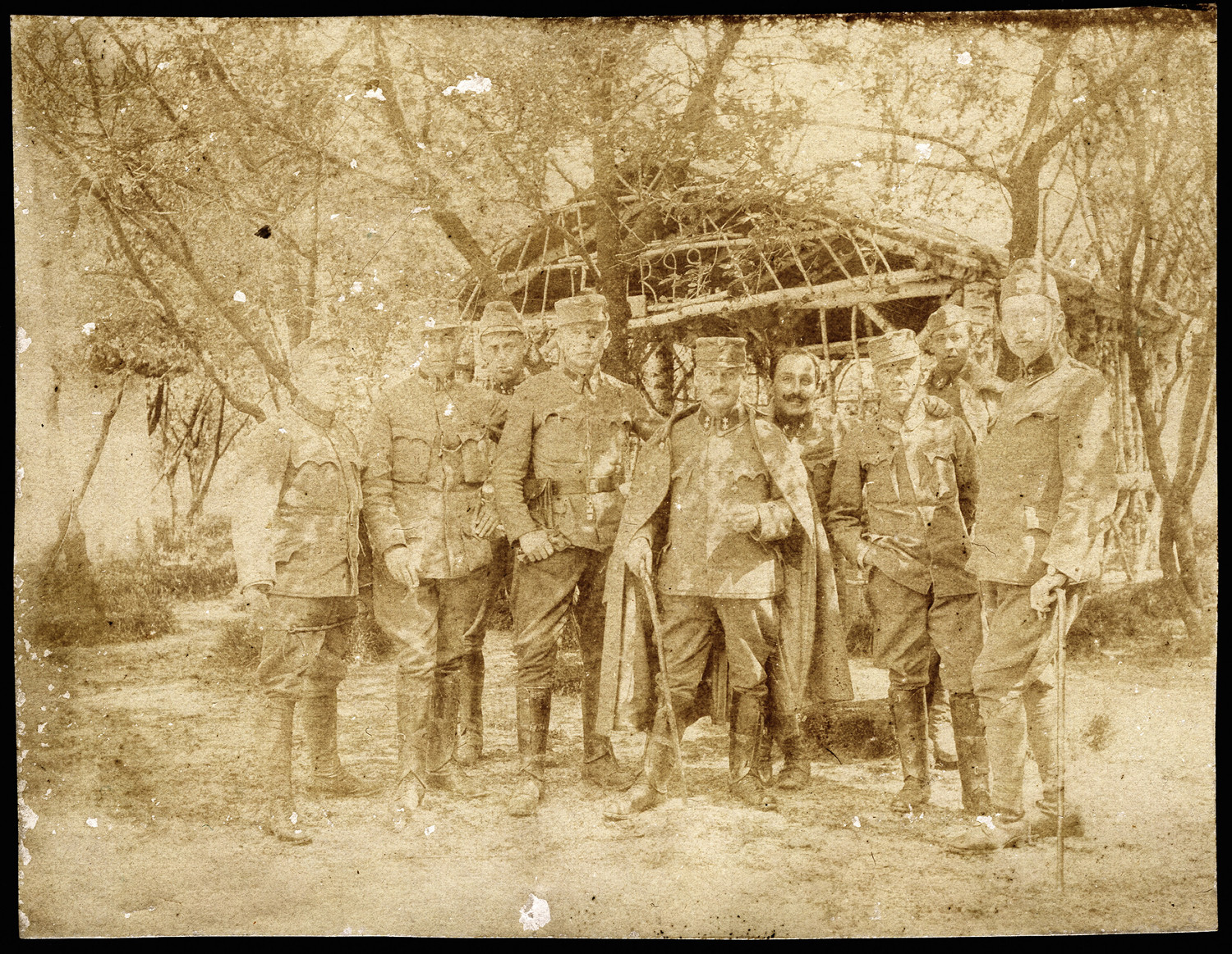 Nazwa: grupa dziewięciu mężczyzn w mundurach, data: 1914-1918, miejsce: , typ obiektu: , wymiary8 x 10,5, opis: oficerowie armii austro-węgierskiej pozują przed altaną