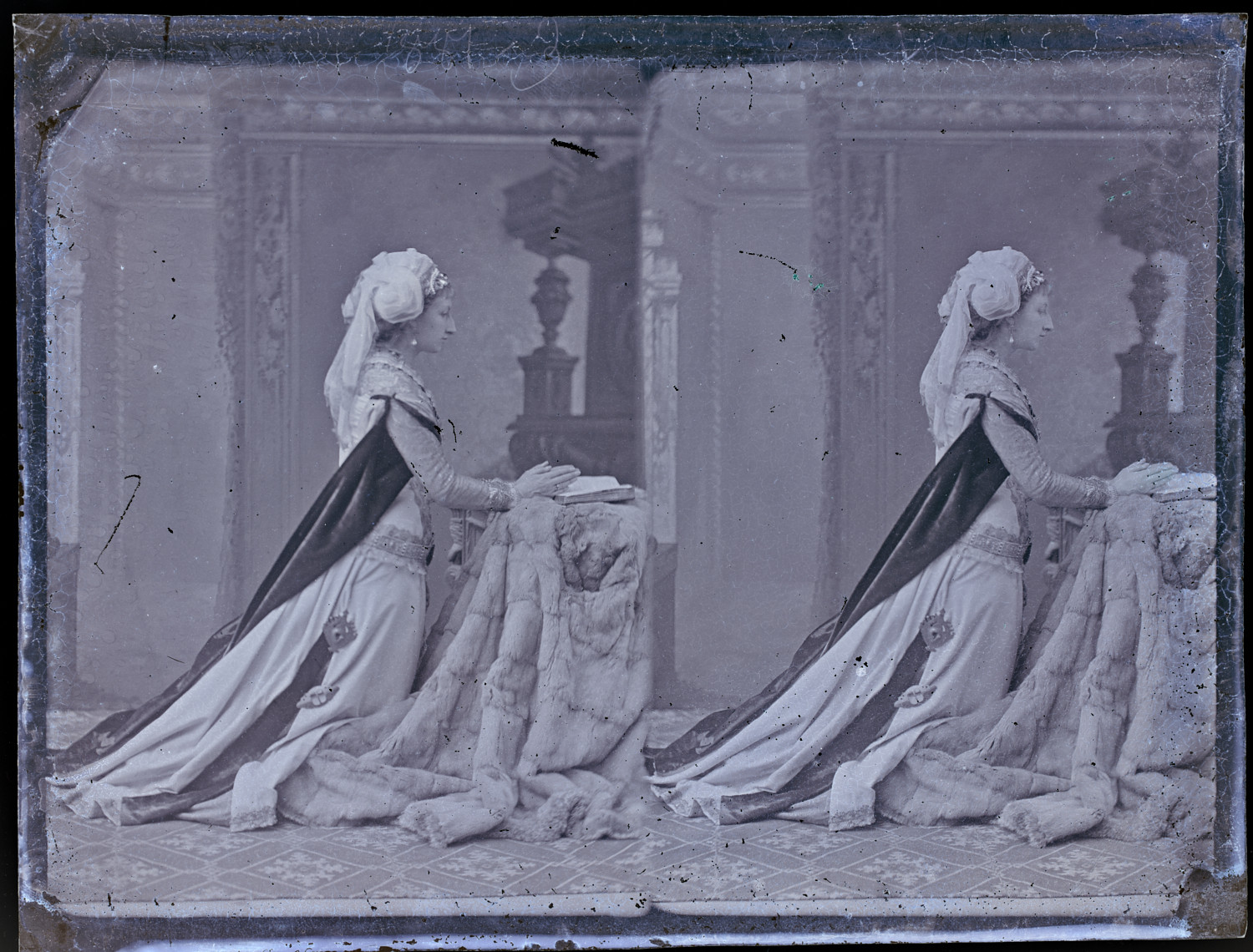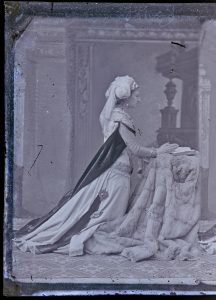 Nazwa: Róża Maria Tarnowska z Branickich, portret w kostiumie, data: marzec 1881, miejsce: , typ obiektu: , wymiary16 x 21, opis: Negatyw z dwiema klatkami: portret tej samej kobiety w identycznej pozie; ujęcie całej postaci z profilu; kobieta w stroju teatralnym (?), klęczy przy klęczniku okrytym futrem; portret w atelier na tle ekranu przedstawiającego wnętrze pałacowe.