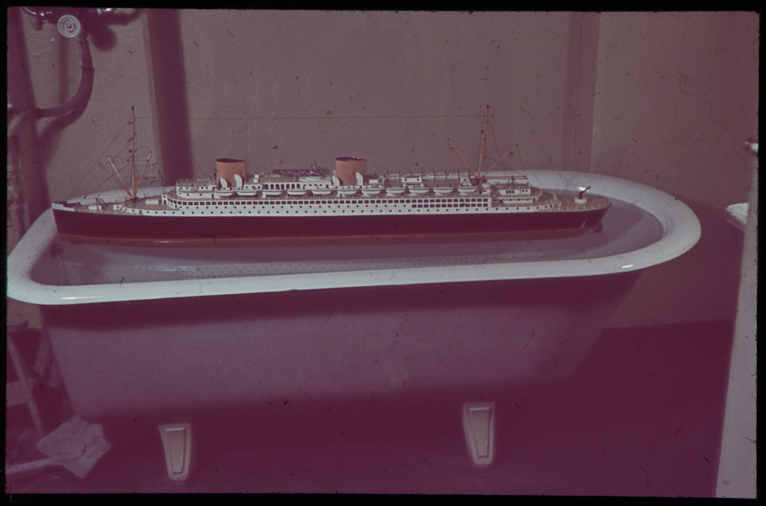 Nazwa: Model okrętu w wannie, data: lata 30. XX wieku, miejsce: , typ obiektu: , wymiary4,9 x 4,9, opis: Wnętrze pomieszczenia, w którym stoi blaszana wanna na nóżkach, wypełniona prawie po brzegi wodą, ujęta bokiem; na wodzie unosi się model statku pasażerskiego; na górze po lewej zawór.