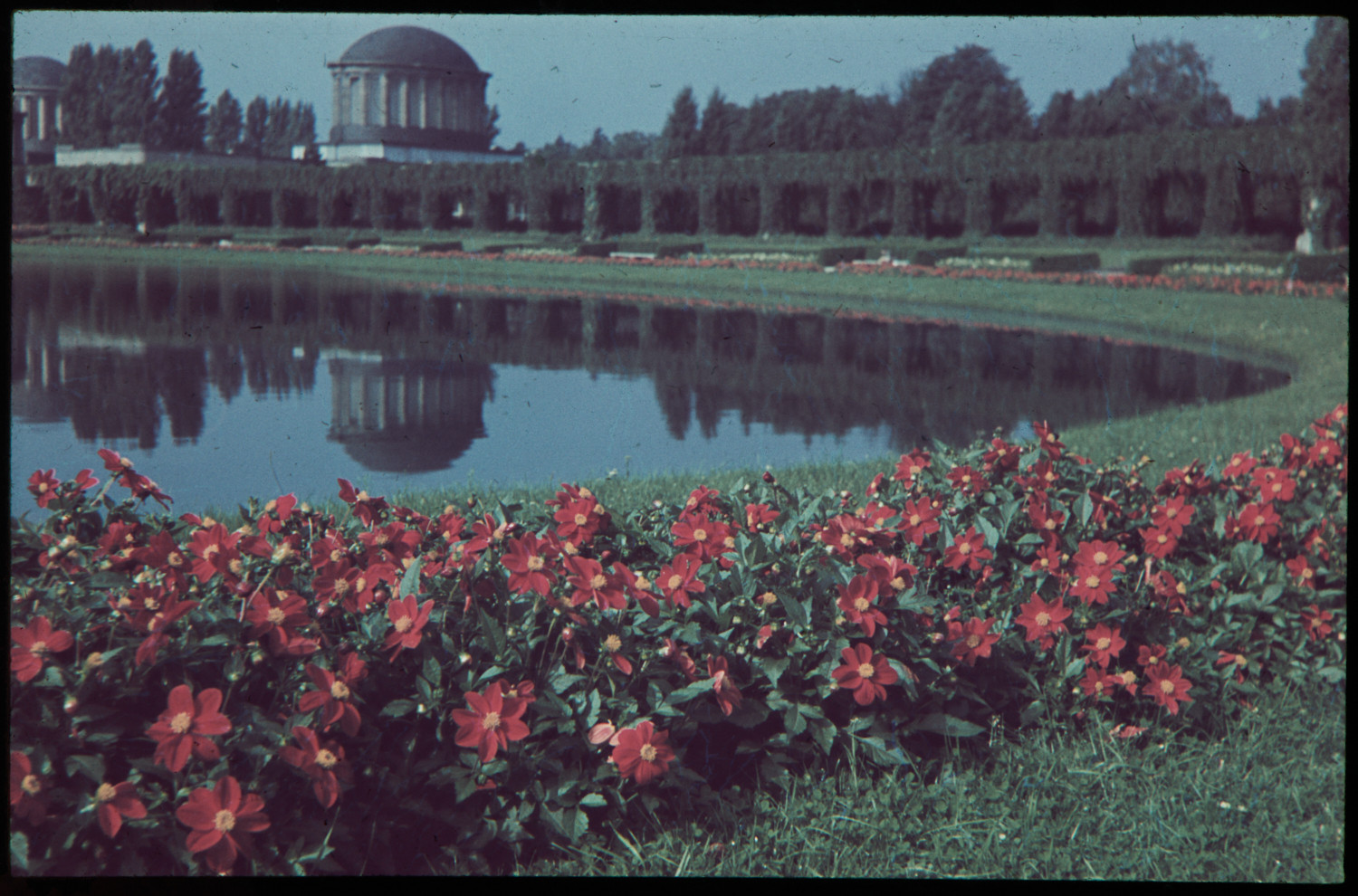 Nazwa: Wrocław, sadzawka i Pawilon Czterech Kopuł, data: lata 30. XX wieku, miejsce: , typ obiektu: , wymiary4,9 x 4,9, opis: Na pierwszym planie brzeg stawu obsadzony kwitnącymi na czerwono kwiatami i obsiany trawą; w głębi zakole sadzawki, tafla wody; na drugim brzegu Pergola; w tle po lewej dwie z czterech kopuł pawilonu; wszystko odbija się w wodzie.