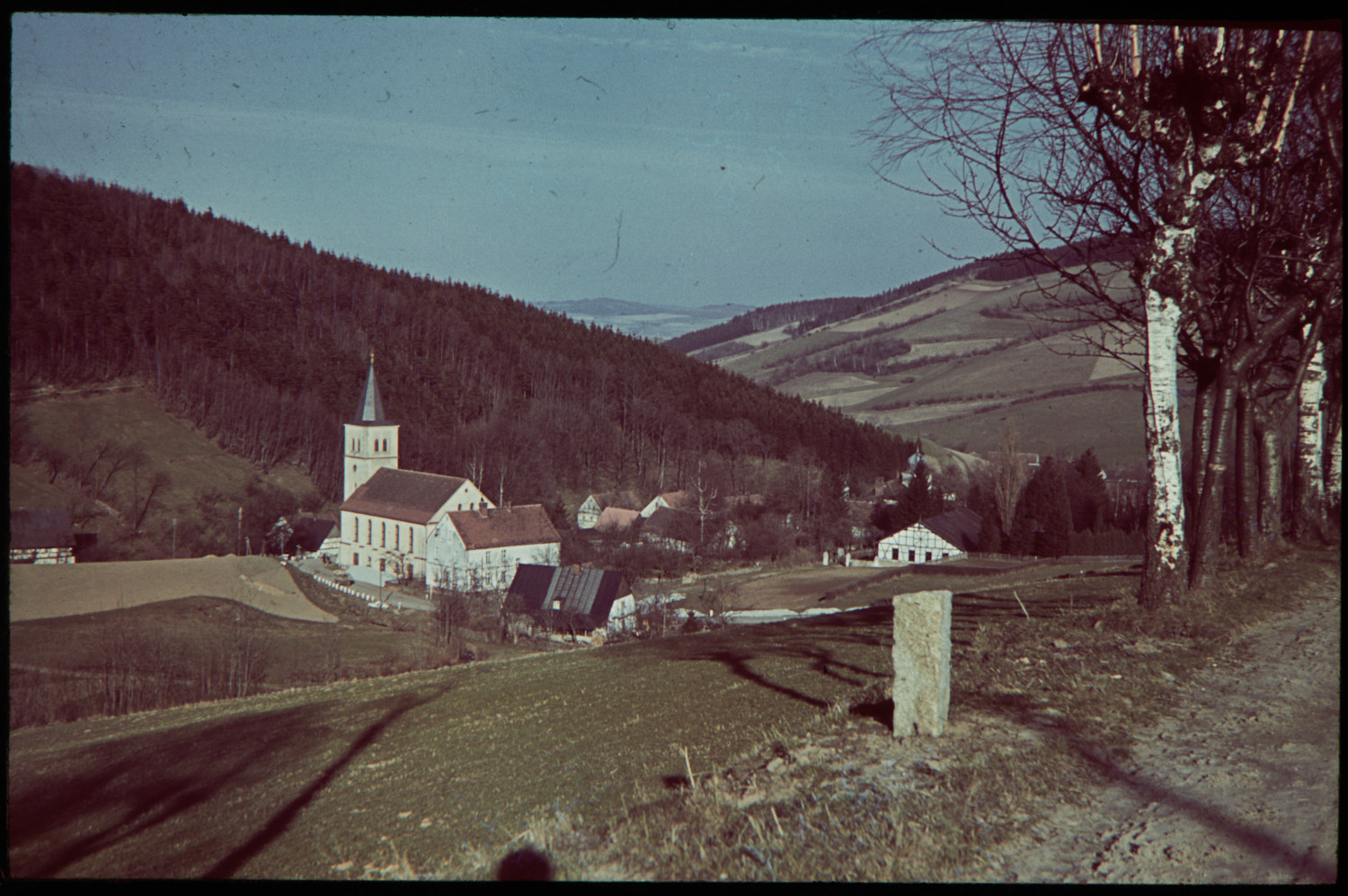 Nazwa: Wieś, data: lata 30. XX wieku, miejsce: , typ obiektu: , wymiary4,9 x 4,9, opis: Ujęcie z oddali, ze skraju ziemnej drogi obsadzonej bezlistnymi drzewami, której fragment po prawej stronie, na położone nieco niżej pola i zabudowania, m. in. kościół z czworoboczną wieżą, z prawej niski budynek szachulcowy; w tle wzniesienia.