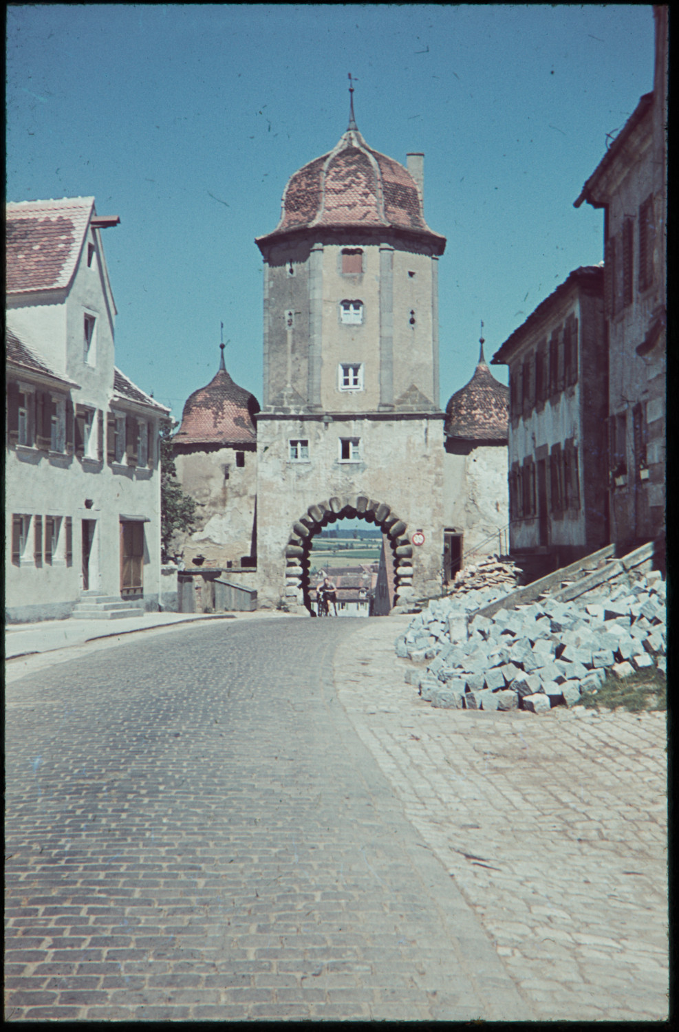 Nazwa: Ellingen, brama miejska Pleinfelder Tor, data: lata 30. XX wieku, miejsce: , typ obiektu: , wymiary4,9 x 4,9, opis: Brukowana uliczka, po bokach trzy piętrowe domy, z prawej sterty bloków kamiennych; w głębi na wprost brama z arkadowym przejazdem, pod nim mężczyzna z rowerem; brama w górnej części ośmioboczna, nakryta kopułą; po bokach dwie mniejsze kopuły.