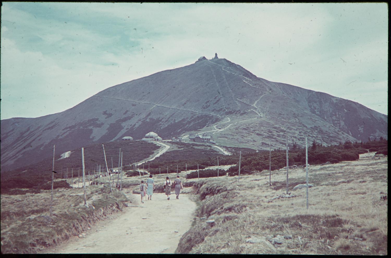 Nazwa: Śnieżka, data: lata 30. XX wieku, miejsce: , typ obiektu: , wymiary4,9 x 4,9, opis: Widok od zachodu; drogą w kierunku szczytu idą dwie kobiety i dwie dziewczyny, ujęte tyłem; w głębi po lewej schronisko Schlesierhaus (Dom Śląski), po prawej schronisko Riesenbaude; na szczycie stare schronisko i obserwatorium meteorologiczne.