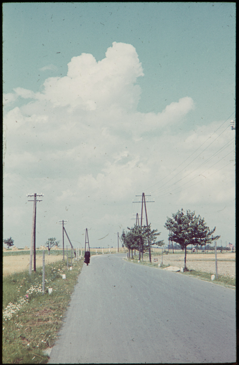 Nazwa: Kobieta idąca szosą, data: lata 30. XX wieku, miejsce: , typ obiektu: , wymiary4,9 x 4,9, opis: Płaski teren, szosa ujęta z lewego pobocza, w głębi skręcająca w prawo; po lewej stronie szosą idzie starsza kobieta w ciemnym ubraniu, ujęta z oddalenia; po bokach drogi kwiaty, drzewa, pola, słupy energetyczne; w tle po prawej dom.