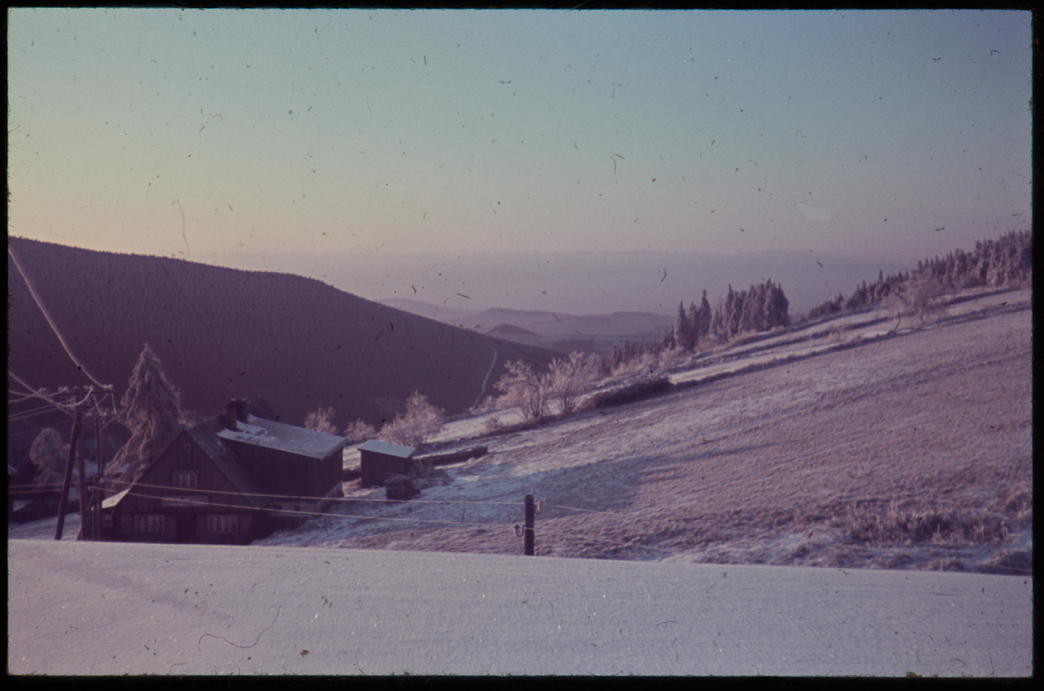 Nazwa: Krajobraz zimowy, data: lata 30. XX wieku, miejsce: , typ obiektu: , wymiary4,9 x 4,9, opis: Ośnieżony, pagórkowaty teren, ujęcie nieco z góry; po lewej, na stoku wznoszącym się ku prawej stronie, drewniany, parterowy dom z poddaszem, obok mała szopa; słupy i kable elektryczne; w głębi krzewy i drzewa; w tle pasma wzniesień.