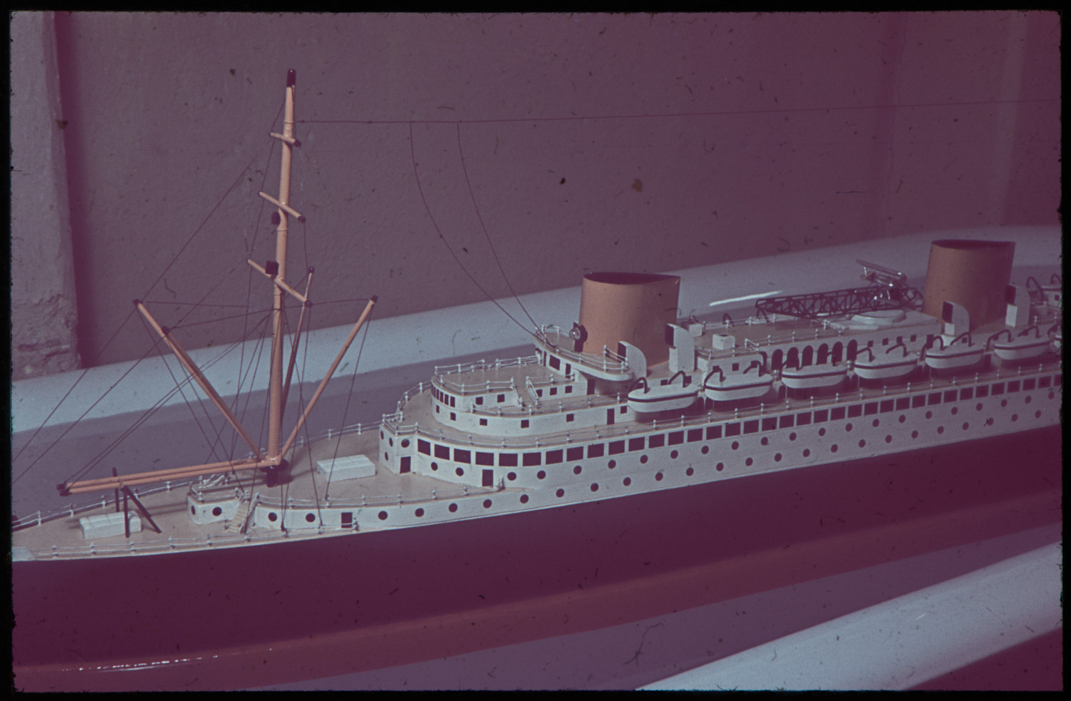Nazwa: Model okrętu w wannie, data: lata 30. XX wieku, miejsce: , typ obiektu: , wymiary4,9 x 4,9, opis: Ujęcie z bliska na wannę wypełnioną prawie po brzegi wodą, ujętą bokiem; na wodzie unosi się model statku pasażerskiego z masztem i dwoma kominami.