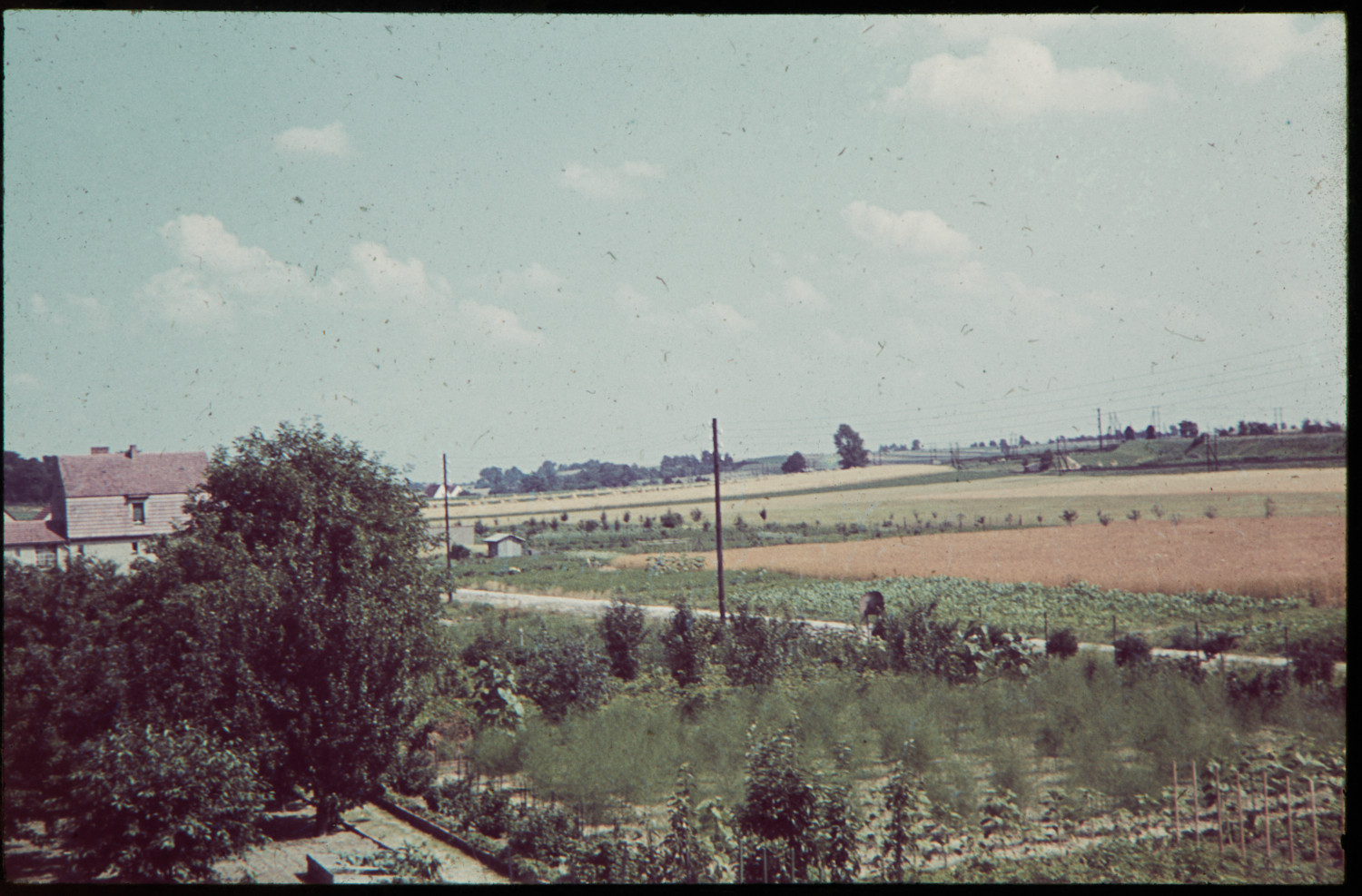Nazwa: Krajobraz wiejski, data: lata 30. XX wieku, miejsce: , typ obiektu: , wymiary4,9 x 4,9, opis: Ujęcie nieco z góry, po lewej drzewa, za nimi dom; pośrodku ogród warzywny; dalej droga ukosem, przy niej dwa słupy energetyczne; po drugiej stronie drogi pola uprawne, mała szopa; w tle dwa domy obok siebie, drzewa, z prawej linia kolejowa (?).