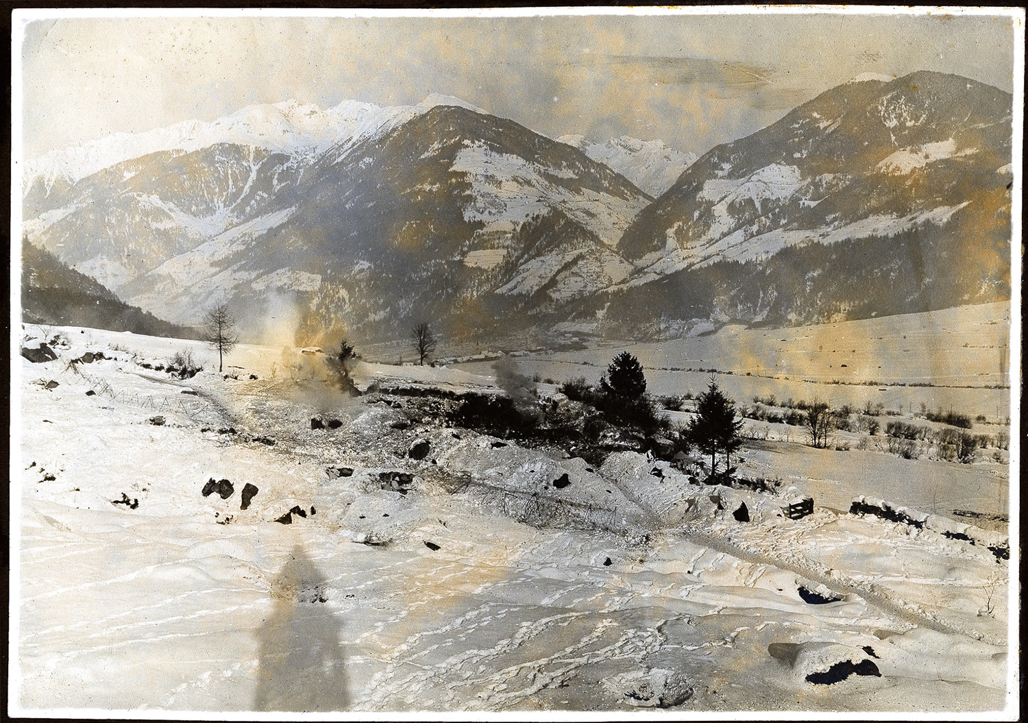 Nazwa: umocnienia na linii frontu, data: 1916-1917, miejsce: , typ obiektu: , wymiary11,5 x 16,5, opis: Pejzaż górski z widocznymi umocnieniami polowymi na linii frontu.