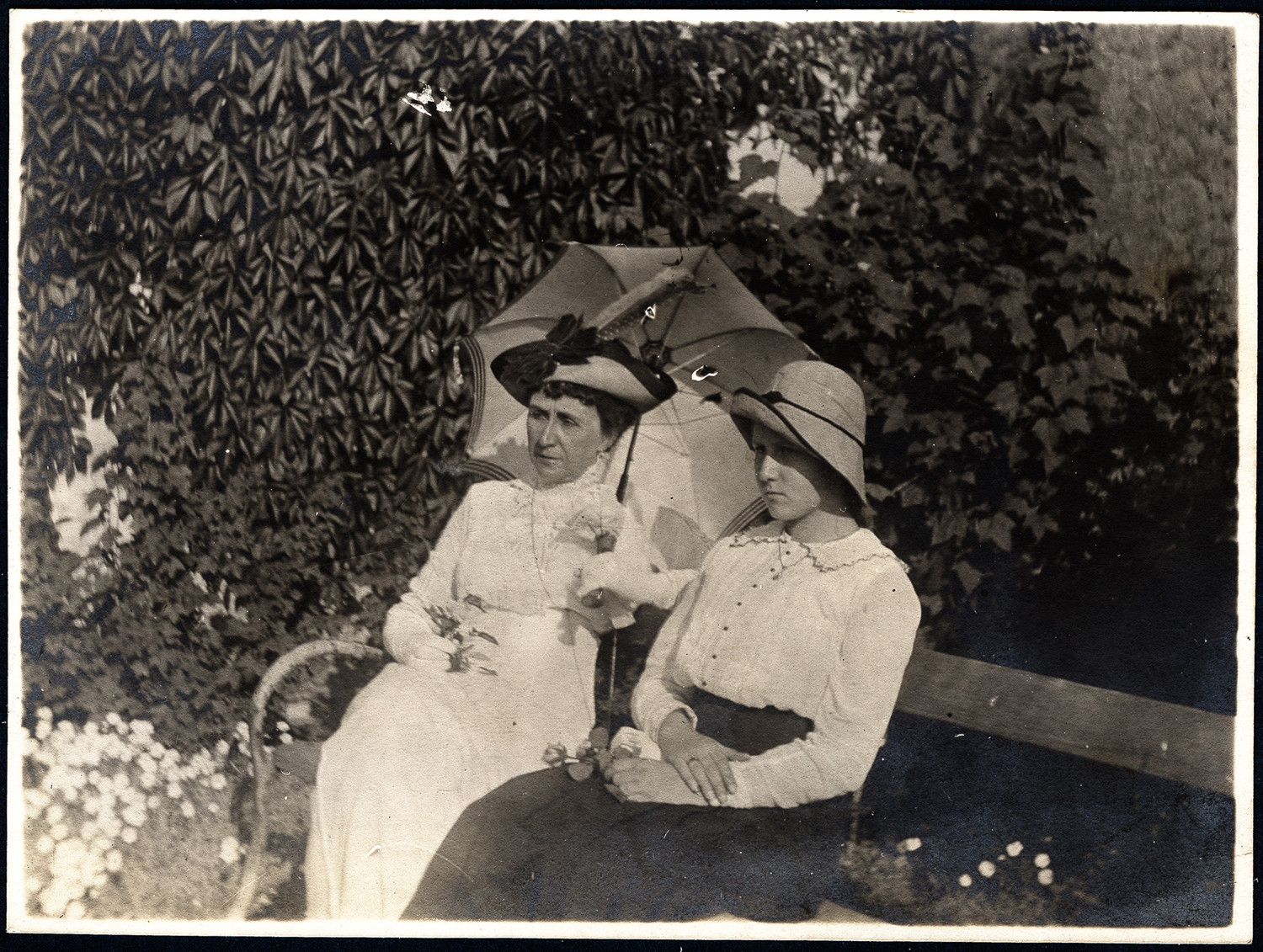 Nazwa: Kraków, ogród, portret dwóch kobiet, data: 06.1915 r., miejsce: , typ obiektu: , wymiary7,5 x 10,2, opis: Portret dwóch kobiet siedzących na ławce w ogrodzie studium rolniczego.