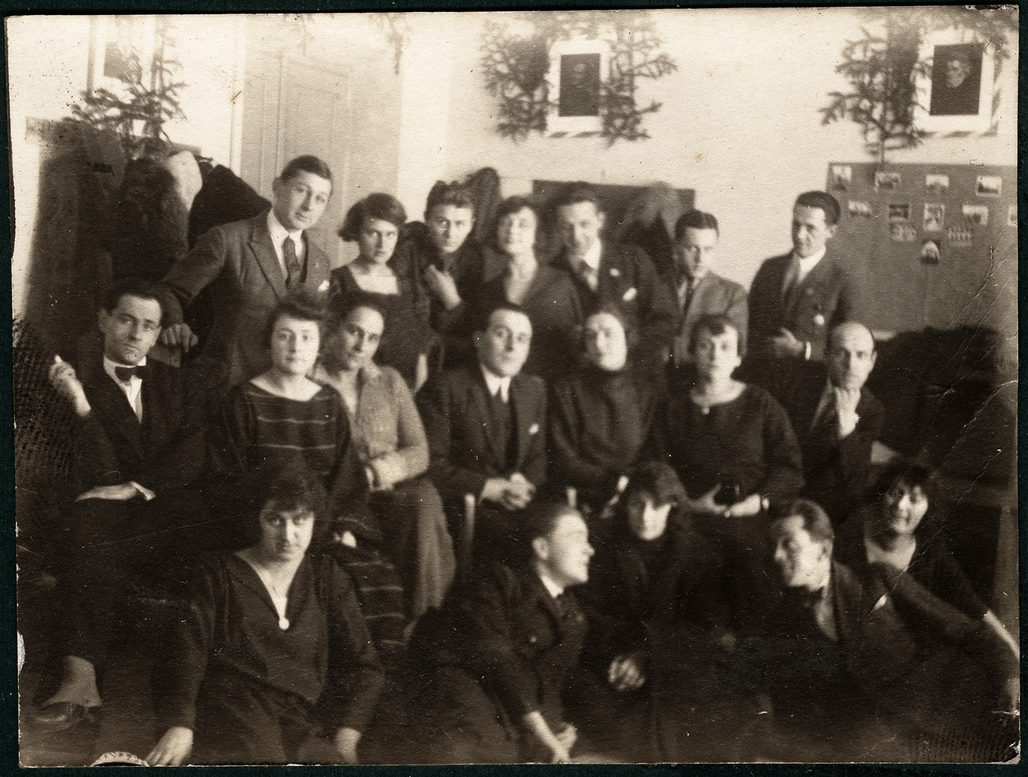 Nazwa: portret grupowy, data: 1914-1918, miejsce: , typ obiektu: , wymiary6,3 x 8,5, opis: Upozowana w trzech rzędach grupa 19 osób sfotografowana we wnętrzu izby szkolnej.