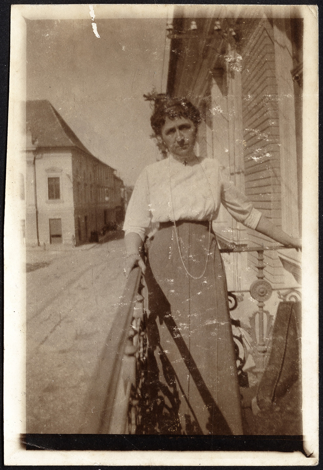 Nazwa: kobieta na balkonie, data: 05.1915, miejsce: , typ obiektu: , wymiary8,9 x 6, opis: Kobieta w średnim wieku stojąca na balkonie kamienicy.