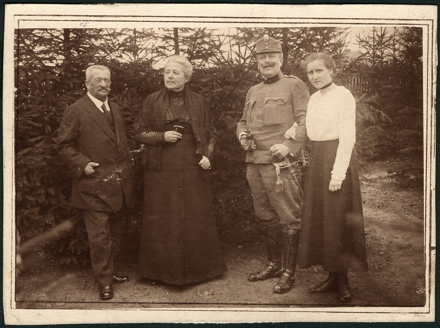Nazwa: Oświęcim, portret grupowy, data: 05.1916, miejsce: , typ obiektu: , wymiary7,6 x 10,3, opis: Dwie pary osób sfotografowane na tle młodego lasu świerkowego.