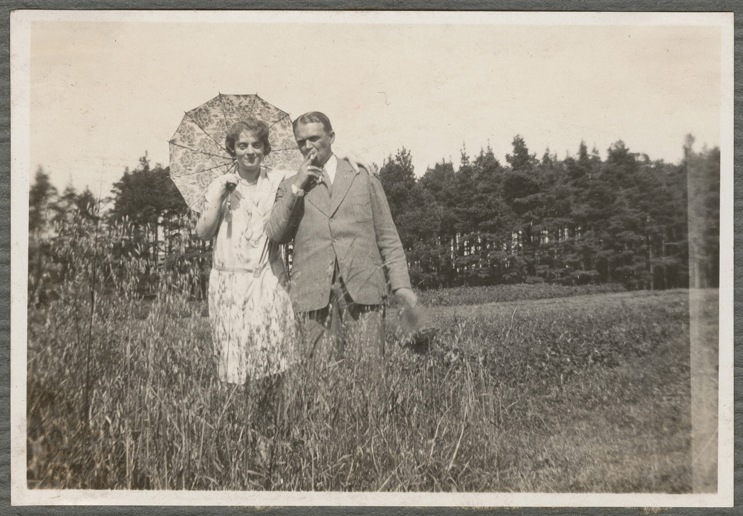 Nazwa: Zofia i Paweł Mussilowie, portret w plenerze, data: 25.08.1929, miejsce: , typ obiektu: , wymiary5,7 x 8,3, opis: Kobieta i mężczyzna (30 lat) stojący na łące, ujęcie w 3/4 na wprost. Zofia w jasnej sukience, z rozłoż. kwiecistą parasolką przeciw słońcu, Paweł zaciąga się dymem z papierosa, ubrany w jasny garnitur, odkryta głowa, w tle las iglasty.