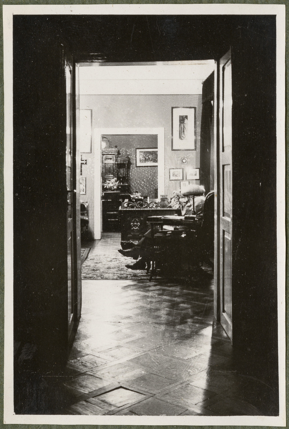 Nazwa: Wnętrze mieszkania Adama Podwina, ul. Kanonicza 7, Kraków, data: l. 30. XX w., miejsce: , typ obiektu: , wymiary8,8 x 6,0, opis: Wnętrze mieszkania. W oddaleniu sylwetka mężczyzny (70 lat), siedzi w fotelu z fajką o długim cybuchu (por fot. 107). W amfiladzie dwa pokoje widoczne w prześwicie drzwi do biblioteki i salonu. Meble i obrazy, drzwi z profilowanymi płycinami.