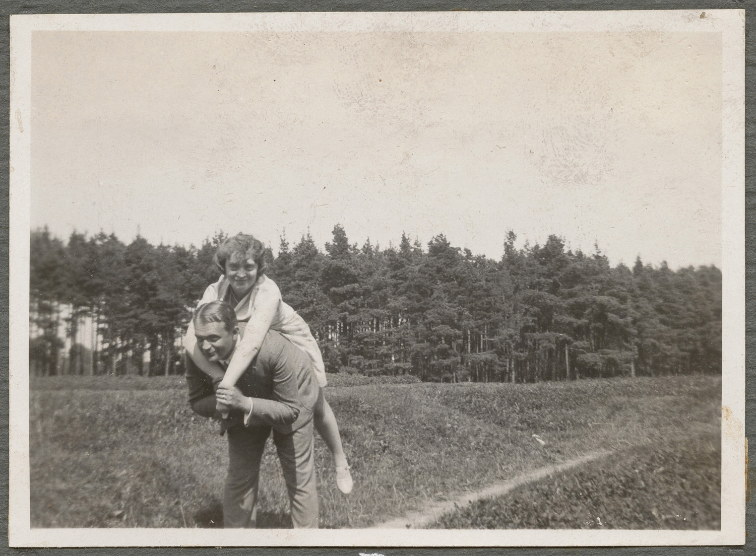 Nazwa: Para w humorystycznej pozie, portret w plenerze, data: 25.08.1929, miejsce: , typ obiektu: , wymiary6,0 x 8,0, opis: Mężczyzna (Paweł Mussil) niosący kobietę (Zofię Kosińską) na plecach. Letnie stroje, uśmiechnięci pozują do fotografii. Łąka, las iglasty, ścieżka.