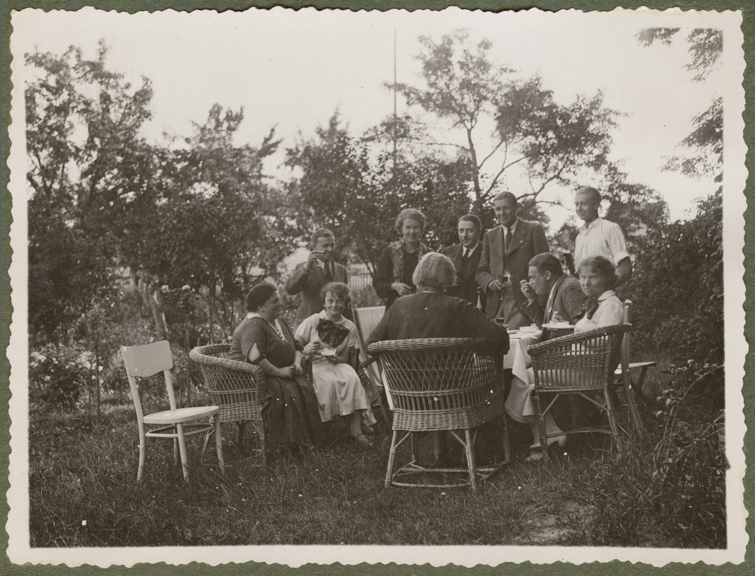 Nazwa: Spotkanie dziesięciu osób, portret zbiorowy w plenerze, data: 06 -08.1935, miejsce: , typ obiektu: , wymiary9,0 x 11,5, opis: Kobiety i mężczyźni (ok. 35-40 l.). Uśmiechnięci, siedzący w ogrodzie latem. Stroje wizytowe: białe sukienki z kokardami, garnitury. Meble wiklinowe, stół z białym obrusem, drewniane krzesło. Wokół trawnik, po bokach krzewy róż. W tle młode drzewa.