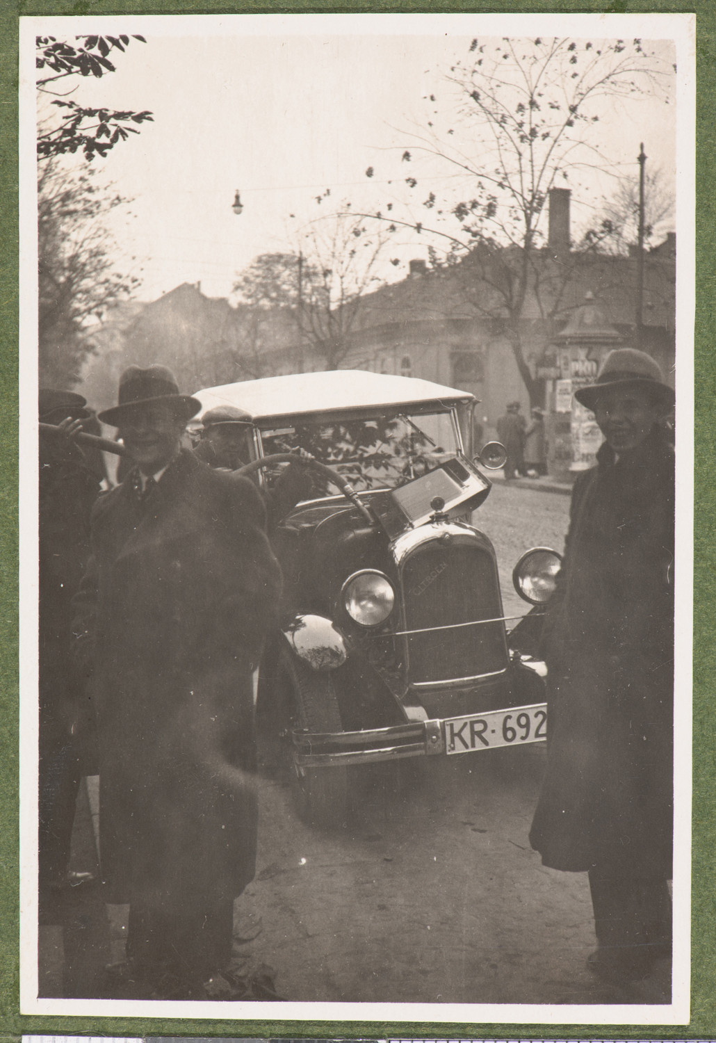 Nazwa: Samochód na ulicy, pejzaż miejski, data: 09.- 11.1935, miejsce: , typ obiektu: , wymiary8,7 x 5,7, opis: Okolice Krakowa. W centrum stoi samochód Tatra, częściowo widoczna rejestracja (KR692...). Uśmiechnięci, eleganccy przechodnie. W tle chodnik, słup ogłoszeniowy, również przechodnie. Jesienna pora, drzewa z resztkami liści, budynek z kominem.