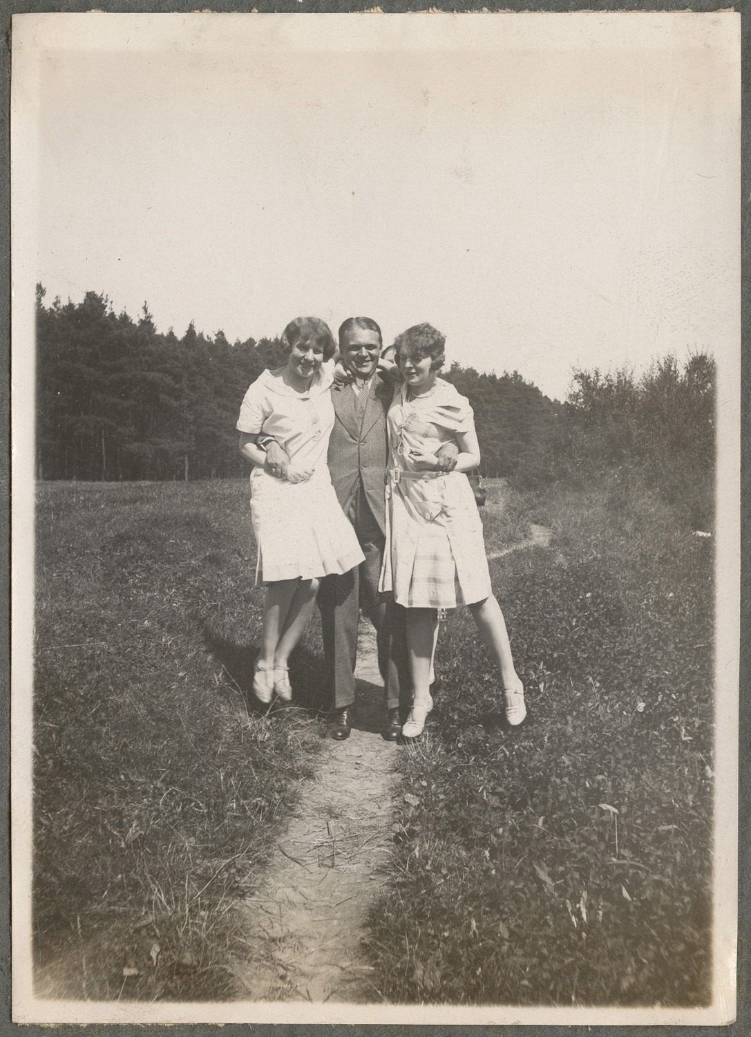 Nazwa: Trzy osoby upozowane humorystycznie, portret w plenerze, data: 25.08.1929, miejsce: , typ obiektu: , wymiary11,6 x 8,3, opis: Dwie kobiety (siostry: Zofia i Karola, ok. 30 lat) i mężczyzna (mąż Zofii, Paweł) pośrodku. Pozuje unosząc obie nieco nad ścieżkę, uśmiechnięci, ujęcie w całej postaci, tło: las iglasty i pejzaż górski.