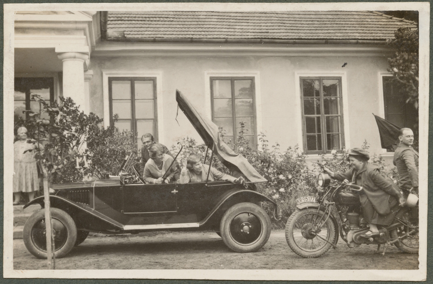 Nazwa: Kosińscy i Mussilowie, scena humorystyczna, data: 08.09.1930, miejsce: , typ obiektu: , wymiary8,8 x 6,0, opis: 3 kobiety i 2 mężczyźni (ok. 40 l.), ucharakteryzowani i upozowani w samochodzie Tatra. M.in. Helena Kosińska w kaszkiecie siedząca na motorze, na schodach ganku Olga Różecka (ok. 70 l.). Branice.