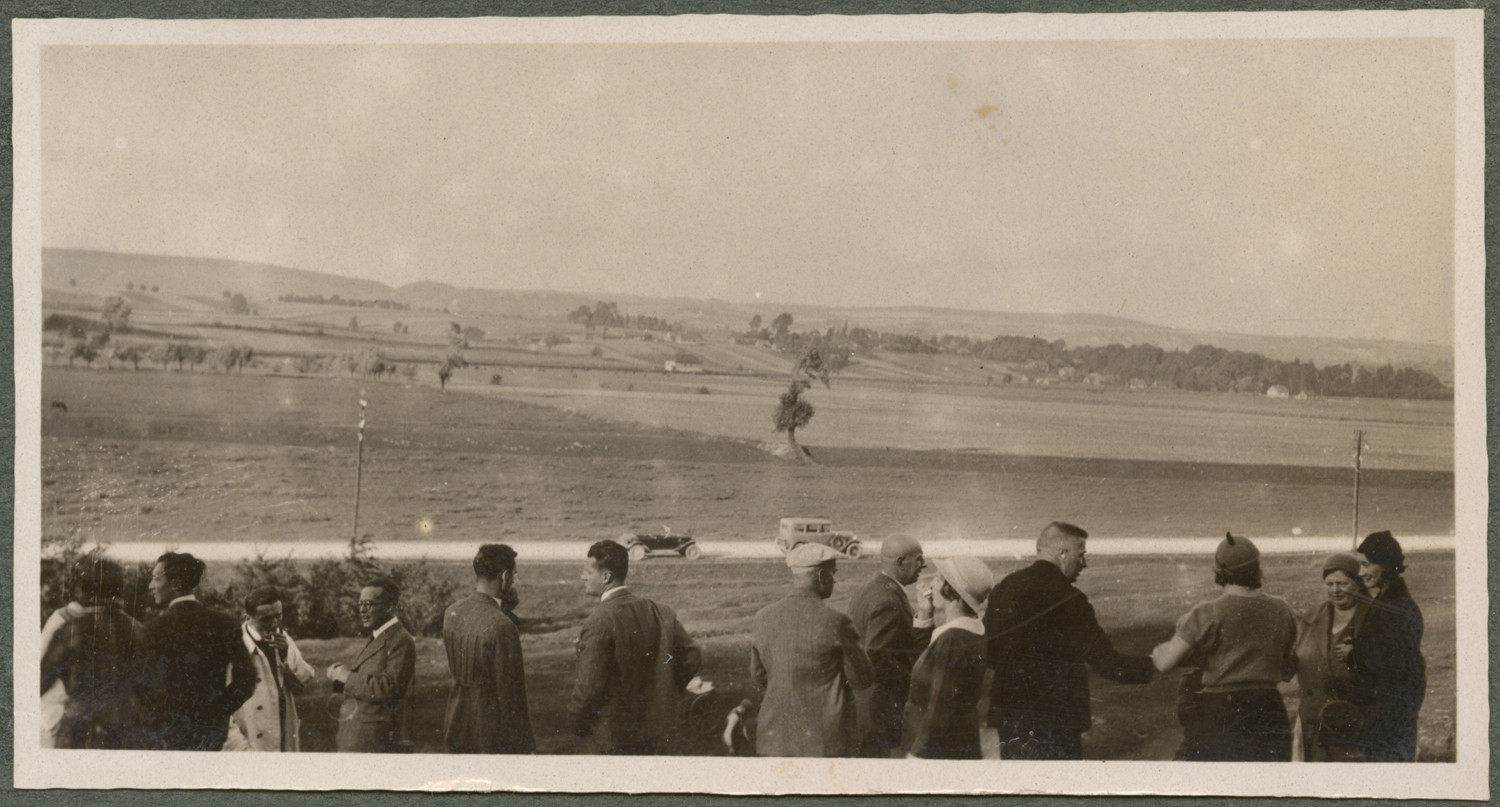 Nazwa: Goście Karyłowskich, portret zbiorowy w plenerze, data: 25.09.1932, miejsce: , typ obiektu: , wymiary4,8 x 9,0, opis: Kobiety i mężczyźni (20-60 l.) stoją. W kadrze ujęci w półpostaci na tle drogi na której mijają się 2 samochody osobowe. Pośrodku samotne drzewo, w dali pola i łąki. W tle pejzaż wiejski. Rudawa.