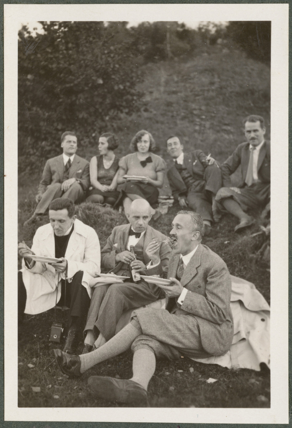 Nazwa: Piknik pracowników Banku Polskiego, portret w plenerze, data: 25.09.1932, miejsce: , typ obiektu: , wymiary9,0 x 6,0, opis: 2 kobiety i 5 mężczyzn (20-60 l.), siedzą na trawie, u stóp wzniesienia. Ubrani w stroje z epoki, garnitury, pumpy oraz sukienki. Większość z nich trzyma talerze i sztućce. Na pierwszym planie dyrektor Banku Polskiego. W tle zarośla i las na wzgórzu.