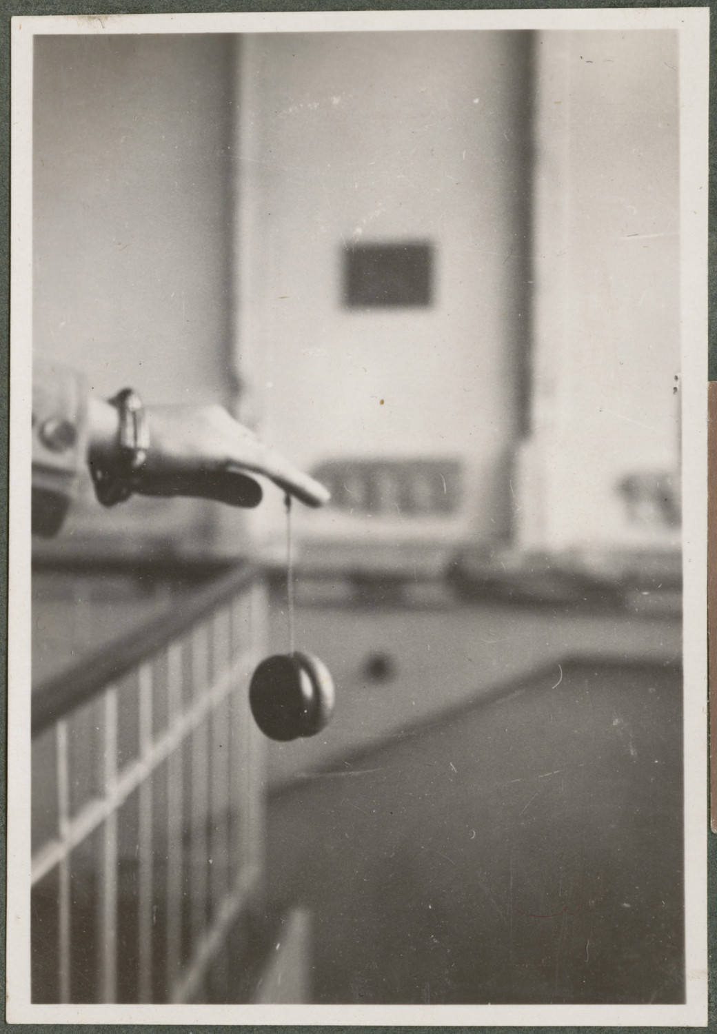 Nazwa: Ręka trzymająca jojo, data: jesień 1932, miejsce: , typ obiektu: , wymiary8,8 x 6,0, opis: Z lewej wyciągnięta i płasko upozowana dłoń (prawdopodobnie Paweł Mussil lub Wanda Korytowska). Fragment rękawa garnituru/żakietu, koszuli, zegarka/bransoletki. Trzyma zabawkę jojo (yoyo) w ruchu, przy balustradzie balkonu.