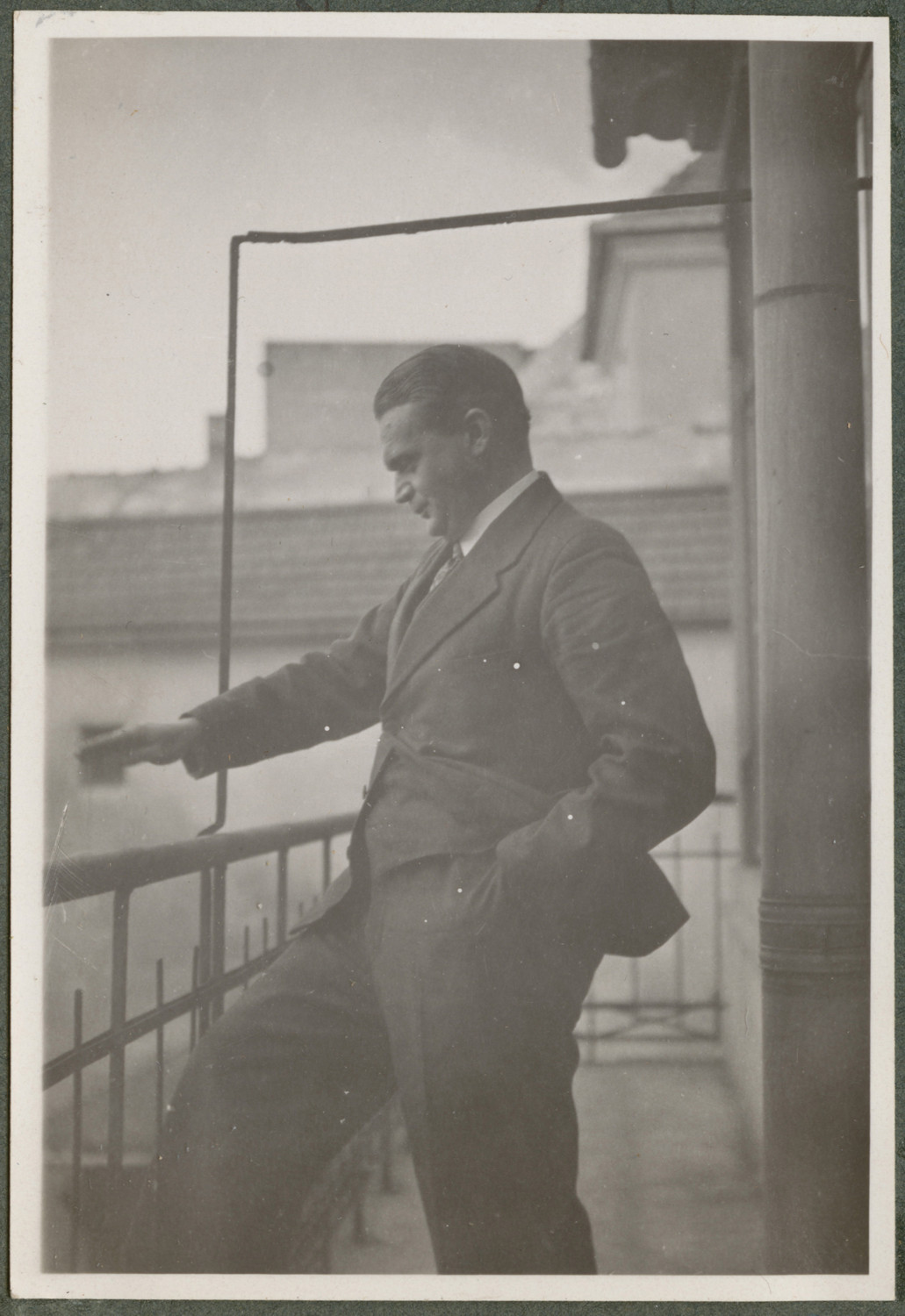Nazwa: Paweł Mussil grający w jo-jo, portret, data: jesień 1932, miejsce: , typ obiektu: , wymiary8,8 x 6,0, opis: Mężczyzna (ok. 40 lat) stojący na balkonie miejskiej kamienicy. Jest zwrócony profilem w lewo, ukazany w 3/4. Ma rękę wyciągniętą płasko przed siebie, za balustradę. Nogę opiera na balustradzie. W tle architektura.