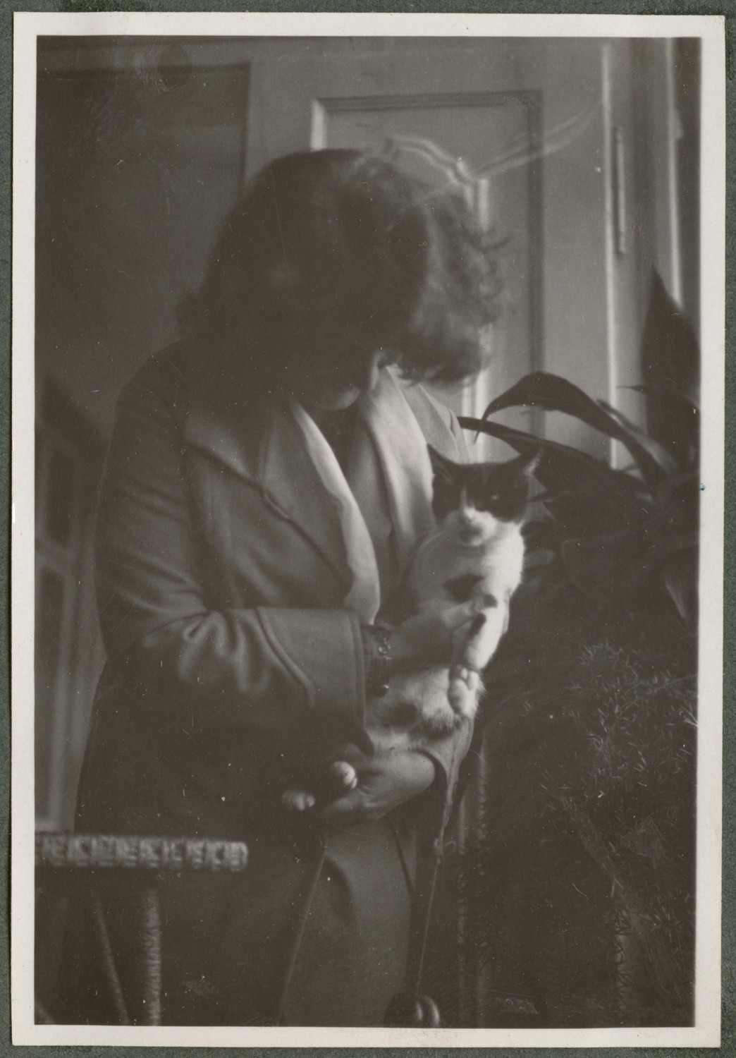 Nazwa: Zofia Mussilowa z kotem i jo-jo, portret, data: jesień 1932, miejsce: , typ obiektu: , wymiary8,8 x 6,0, opis: Kobieta (35-40 l.), stoi we wnętrzu mieszkania. Ujęta jest w 3/4, głowa w prawo oraz jest schylona. Trzyma łaciatego kota i jojo. Ubrana jest w jasny płaszcz, włosy ma ułożone w fale. Widać bambusowy stolik. W tle jasne drzwi i roślina doniczkowa.