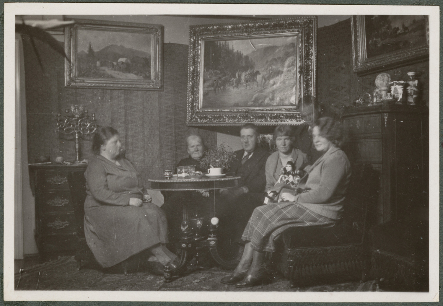 Nazwa: Rodzina Kosińskich, portret zbiorowy, data: 13.11.1932, miejsce: , typ obiektu: , wymiary5,8 x 6,5, opis: 4 kobiety (Maria Kosińska w starszym wieku i trzy córki: Helena Karola i Zofia), pośrodku Stanisław Karyłowski (mąż Karoli - solenizant). Ujęci w całej postaci przy stole. Pokój wypełniony meblami, obrazami i bibelotami. Kanonicza 7, Kraków.