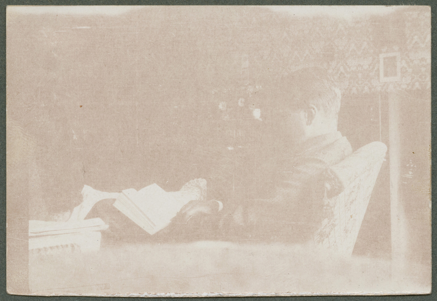 Nazwa: Paweł Mussil, portret we wnętrzu, data: 13.11.1932, miejsce: , typ obiektu: , wymiary5,8 x 8,8, opis: Mężczyzna (40 l.) siedzący w fotelu na tle makaty, czytający książkę. Ujęty w półpostaci, profilem w lewo, w salonie na Kanoniczej 7 w Krakowie.