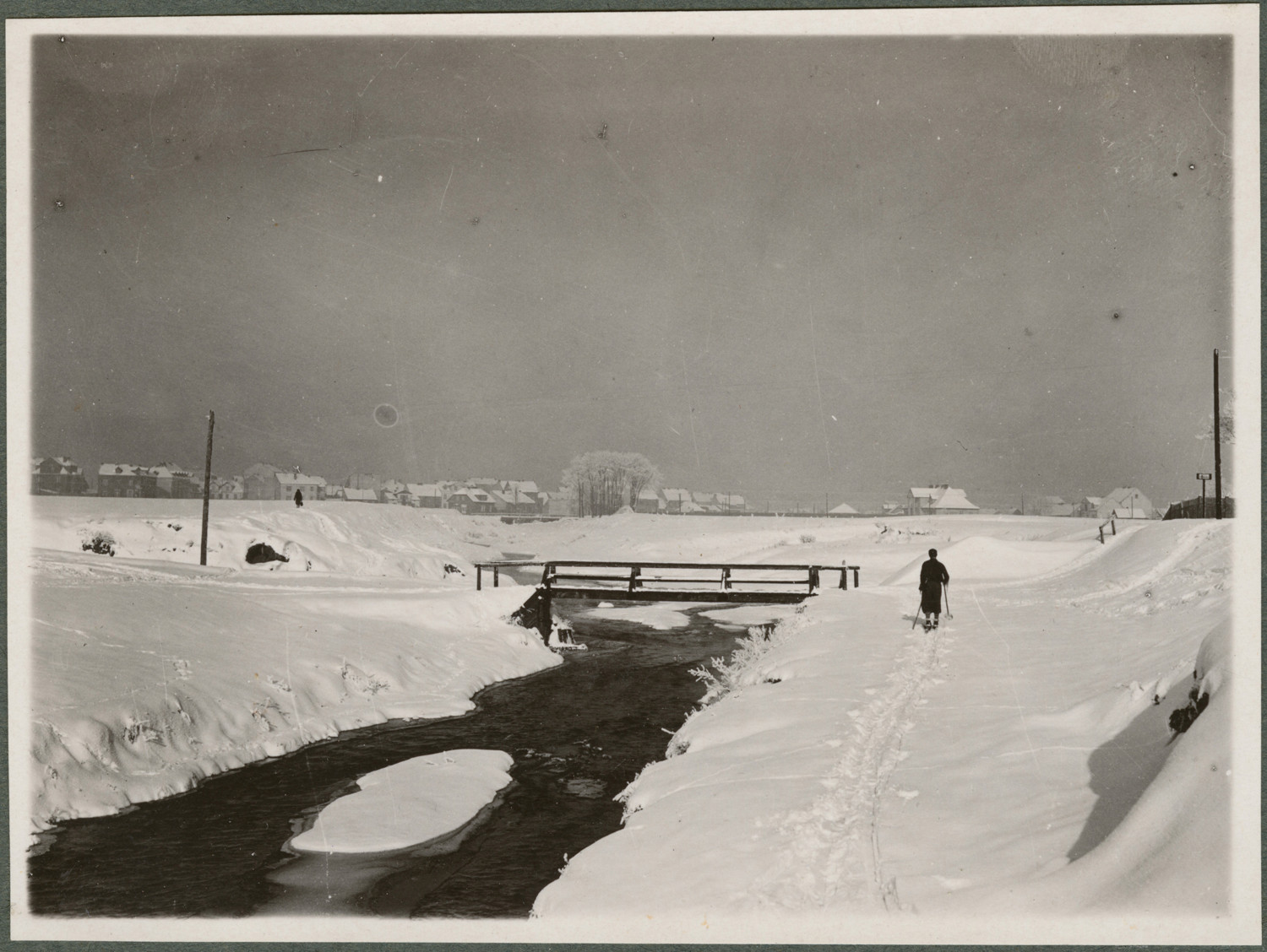 Nazwa: Most na rzece w Rudawie, pejzaż zimowy, data: zima 1933, miejsce: , typ obiektu: , wymiary8,5 x 11,3, opis: Równina. Rzeka o ośnieżonych brzegach, ciemna woda z krą (wysepką). Widoczny mały most (kładka z poręczami), słupy trakcji elektrycznej. Po prawej sylwetkowo ujęty narciarz, liczne ślady nart i butów. W tle oszronione korony drzew i budynki.