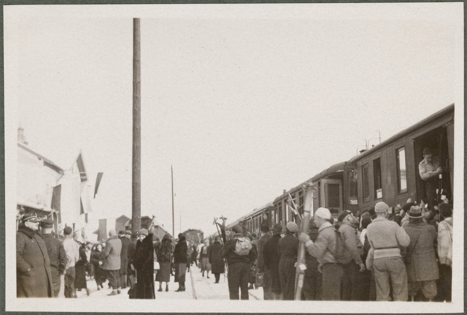 Nazwa: Turyści i narciarze na dworcu zimą, Zakopane, data: 19.02.1933, miejsce: , typ obiektu: , wymiary8,8 x 6,0, opis: Stojący pociąg po prawej. Uchwycony tłum na peronie, z nartami i bagażami. Widoczne stroje sportowe i zimowe.
