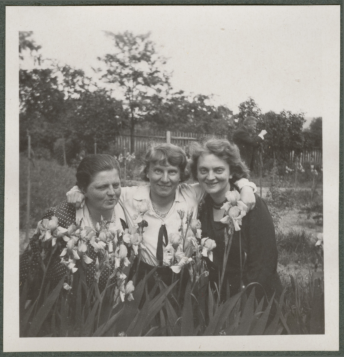 Nazwa: Trzy siostry Kosińskie w ogrodzie, portret w plenerze, data: czerwiec 1933, miejsce: , typ obiektu: , wymiary6,0 x 6,0, opis: 3 kobiety (35-40 l.) stojące w ogrodzie wśród lilii. Są uśmiechnięte. Karola pośrodku obejmuje swoje siostry Helenę i Zofię. Ujęcie na wprost, widoczne w półpostaci. W tle wiejski krajobraz. Rudawa.