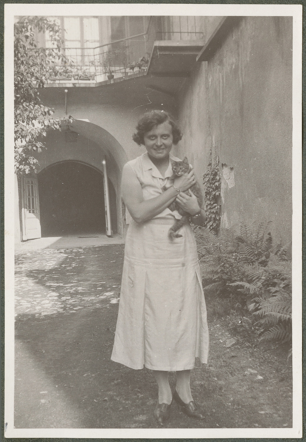 Nazwa: Helena Szlachtowska z kotem na rękach, portret, data: 01.07.1933, miejsce: , typ obiektu: , wymiary8,4 x 6,0, opis: Ciemnowłosa kobieta (40 l.) stoi na dziedzińcu. Ubrana w jasną garsonkę, pończochy, buty. Ma pręgowanego kota na rękach. Widoczne paprocie pod murem. W głębi pełny łuk bramy, balkon opleciony dzikim winem.