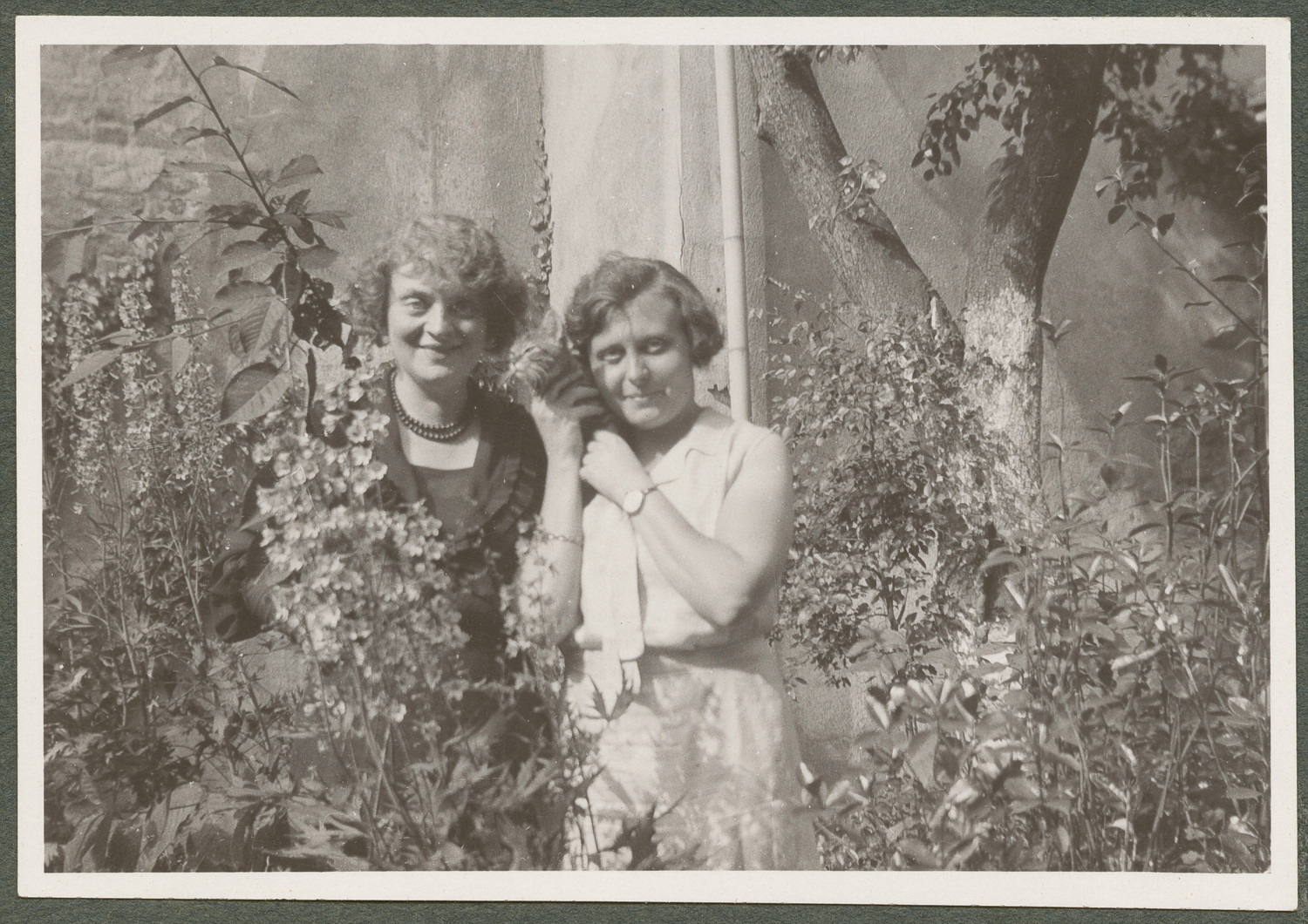 Nazwa: Dwie kobiety z kotem w ogrodzie, portret w plenerze, data: 01.07.1933, miejsce: , typ obiektu: , wymiary5,8 x 8,5, opis: 2 kobiety (40 l.) stojące wśród ogrodowych kwiatów. Są uśmiechnięte, fryzury krótkie ułożone w fale, ubrane w letnie sukienki (ciemną i jasną), korale, zegarek na ręce. Helena pozuje z kotem. W tle drzewo i roślinność. Kanonicza 7, Kraków.