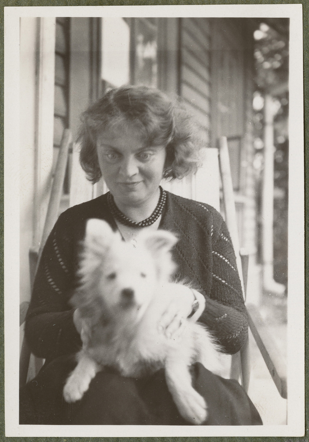 Zofia Mussilowa z białym pieskiem, portret na werandzie