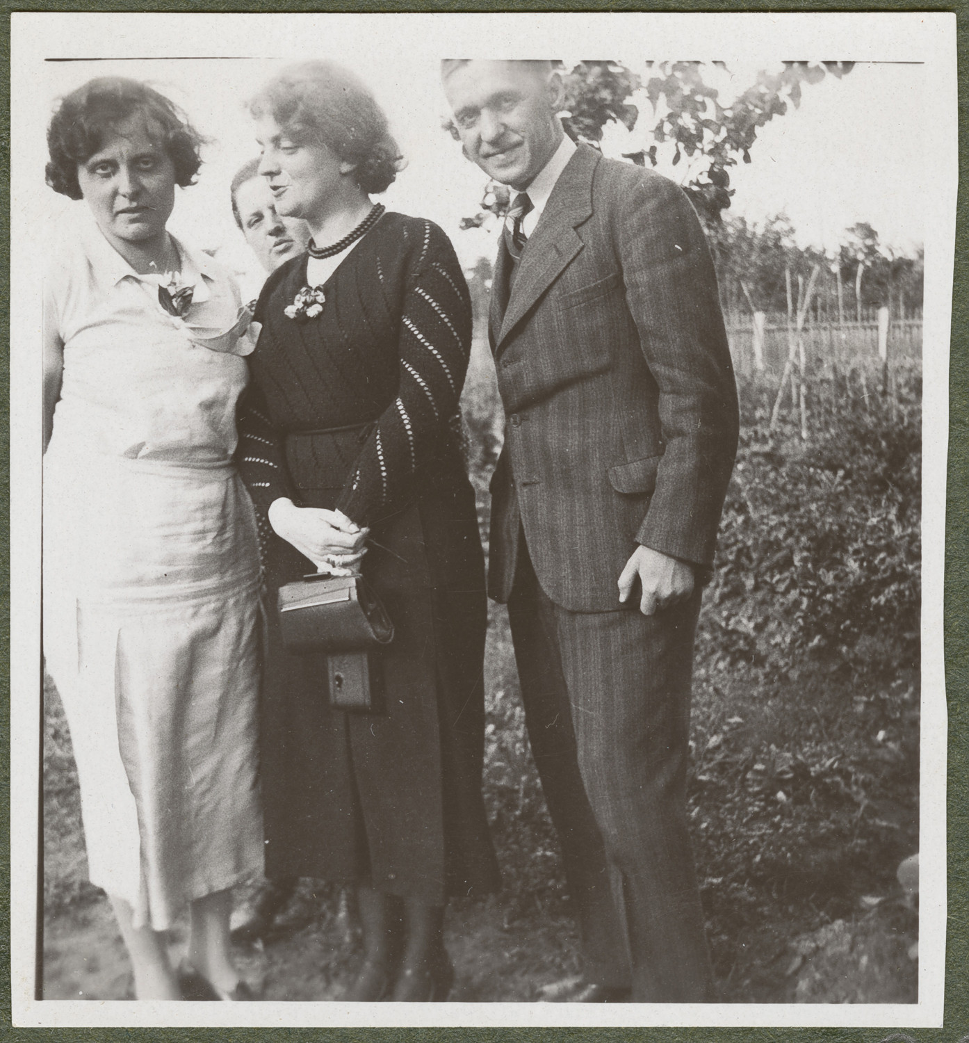 Nazwa: Cztery osoby w ogrodzie, portret w plenerze, data: 30.08.1932, miejsce: , typ obiektu: , wymiary5,8 x 5,5, opis: Trzy kobiety i nieznany mężczyzna (ok. 40 lat). Stoją w ogrodzie. Ubrani w stroje letnie, wizytowe. Widoczne broszki, torebka i korale. Goście rodziny Karyłowskich. Rudawa.