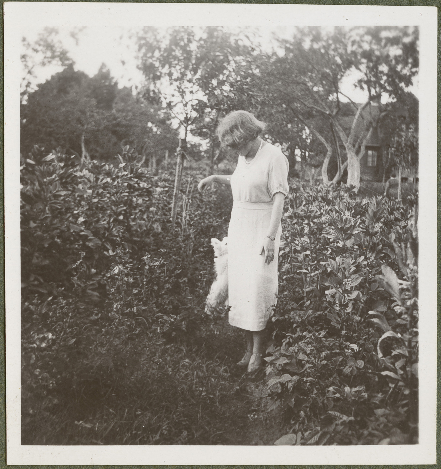 Nazwa: Karola Karyłowska z psem, portret w ogrodzie, data: 02.07.1933, miejsce: , typ obiektu: , wymiary5,5 x 5,8, opis: Kobieta (35-40 l.) stoi w ogrodzie i bawi się z białym pieskiem. Ukazana w całej postaci, zwrócona w lewo, głowa odwrócona od obiektywu, pochylona. Ubrana w białą letnią sukienkę, włosy w fale. W tle bujna roślinność, w głębi po prawej dom. Rudawa.